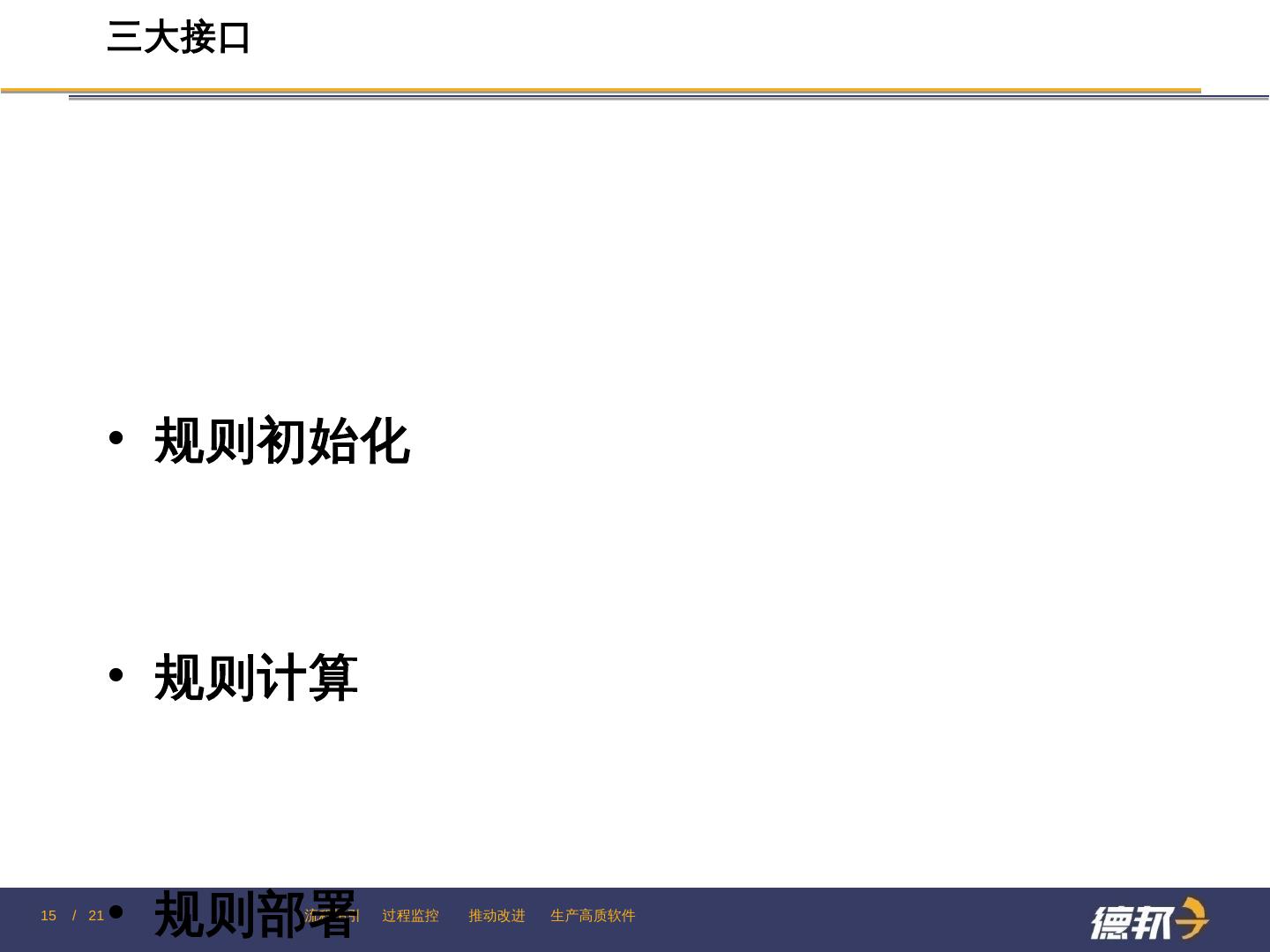 15 . 三大接口 • 规则初始化 • 规则计算 15 / 21 • 规则部署 流程指引 过程监控 推动改进 生产高质软件