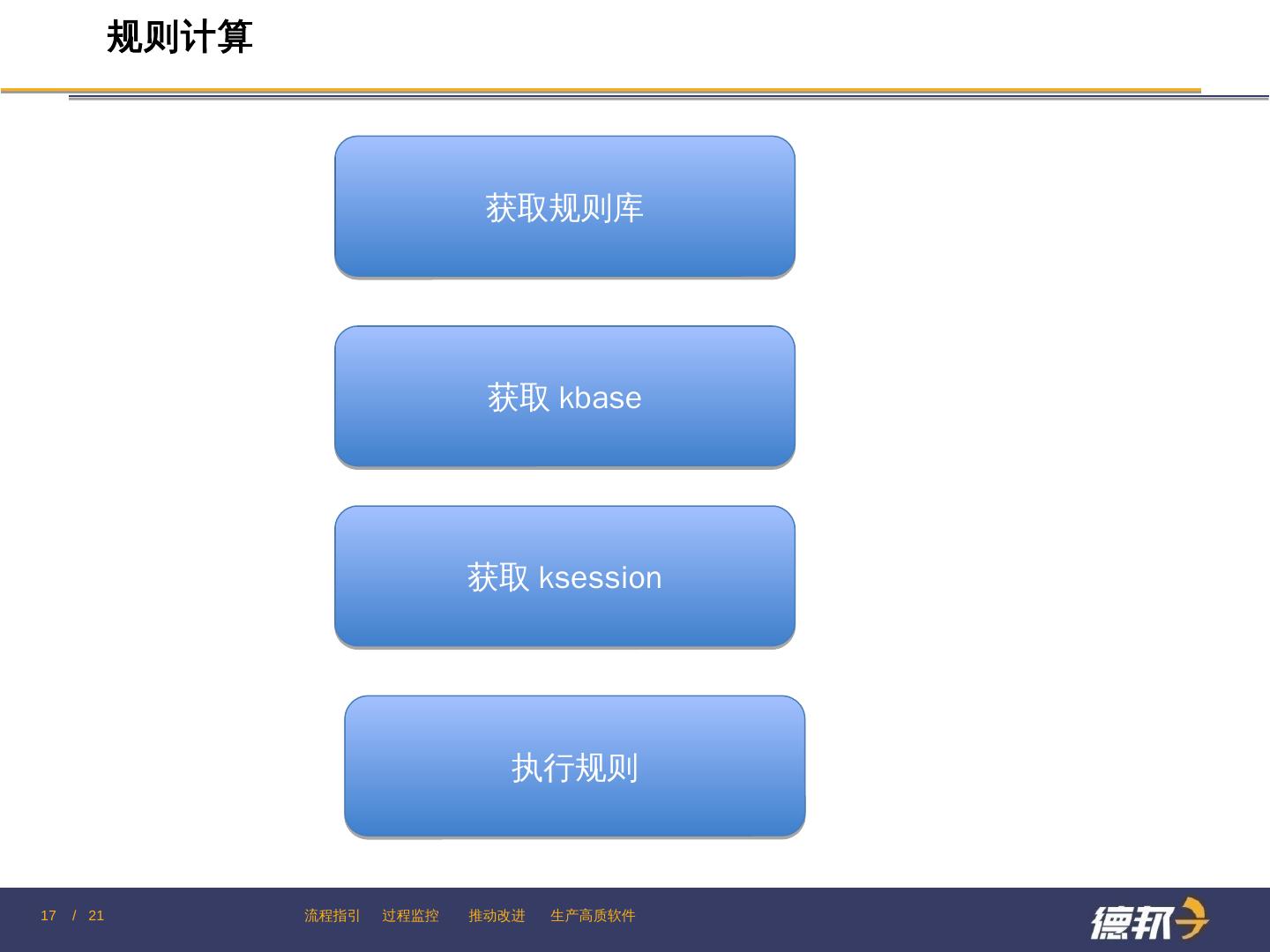 17 . 规则计算 获取规则库 获取 kbase 获取 ksession 执行规则 17 / 21 流程指引 过程监控 推动改进 生产高质软件