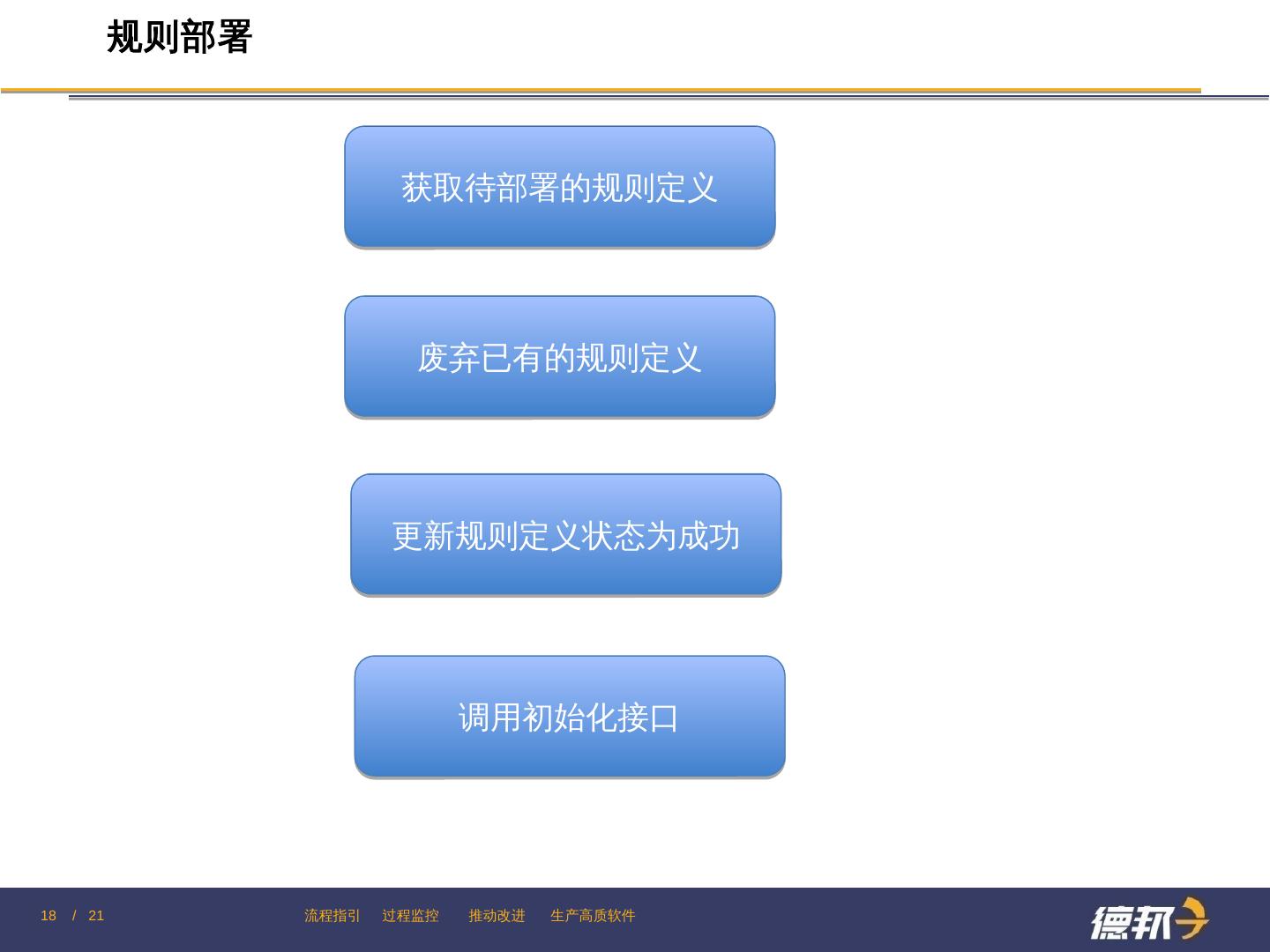 18 . 规则部署 获取待部署的规则定义 废弃已有的规则定义 更新规则定义状态为成功 调用初始化接口 18 / 21 流程指引 过程监控 推动改进 生产高质软件