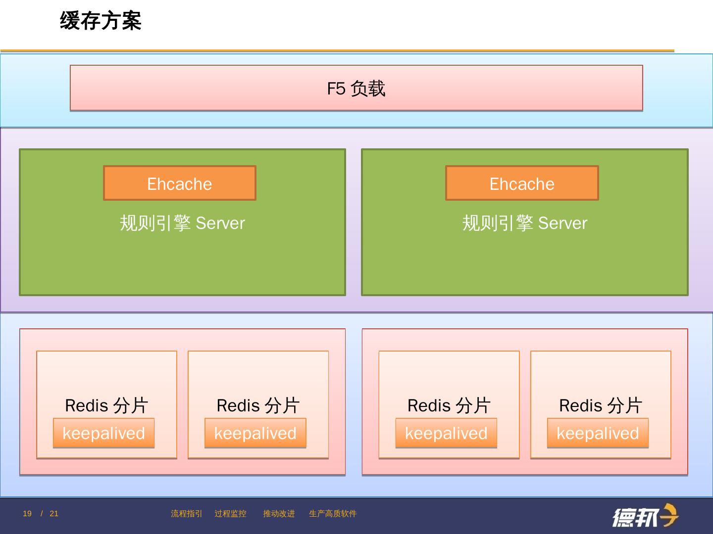 19 . 缓存方案 F5 负载 Ehcache Ehcache 规则引擎 Server 规则引擎 Server Redis 分片 Redis 分片 Redis 分片 Redis 分片 keepalived keepalived keepalived keepalived 19 / 21 流程指引 过程监控 推动改进 生产高质软件