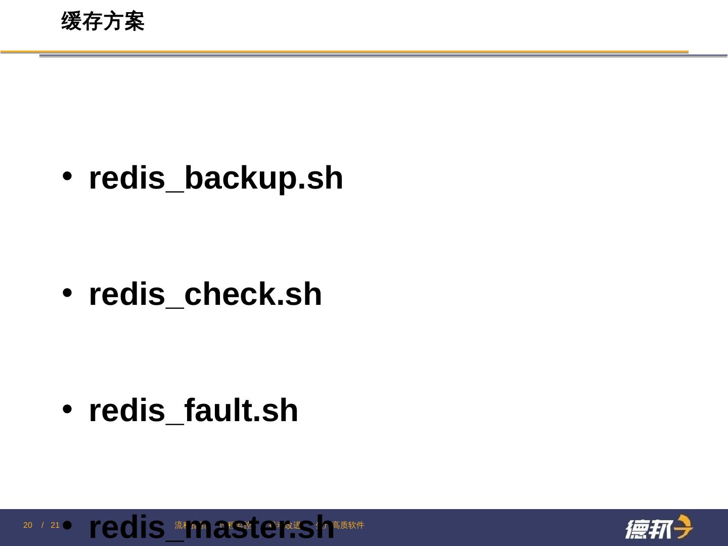 20 . 缓存方案 • redis_backup.sh • redis_check.sh • redis_fault.sh 20 / 21 • redis_master.sh 流程指引 过程监控 推动改进 生产高质软件