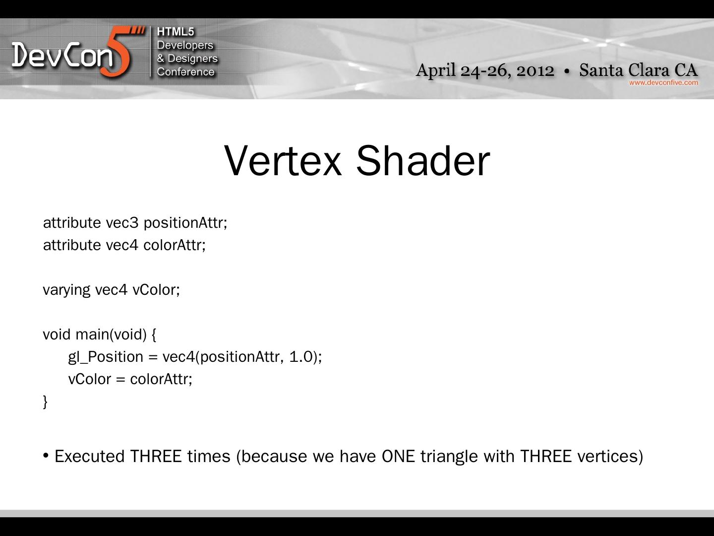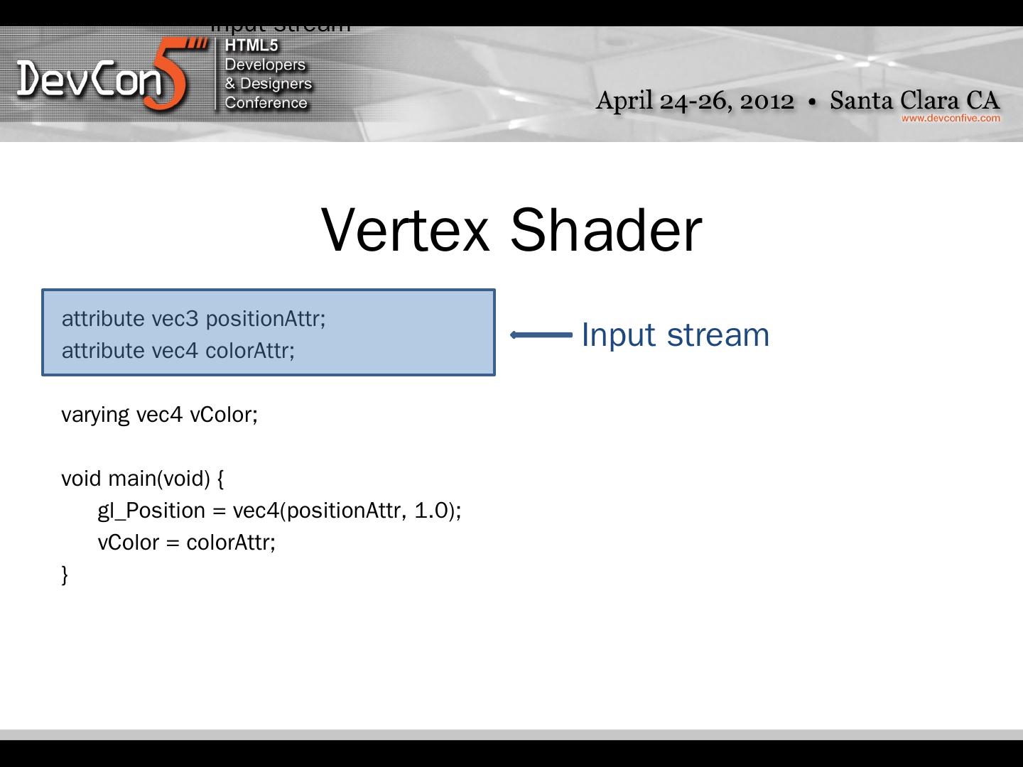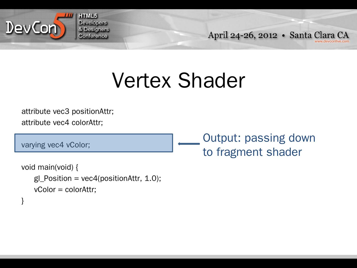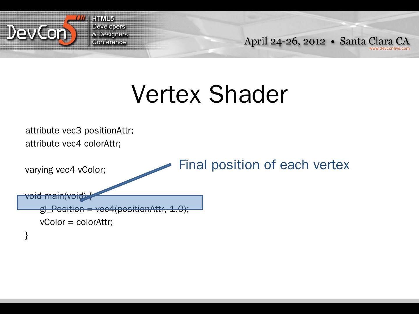 Adapted from Giles Thomas' Learning WebGL Lesson 2; Code is checked in to http://webglsamples.googlecode.com/ under hello-webgl/. Vertex Shader.