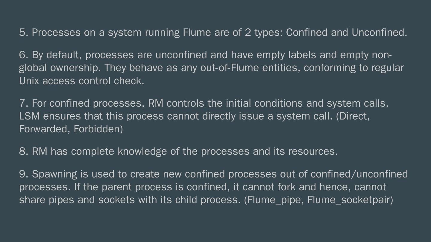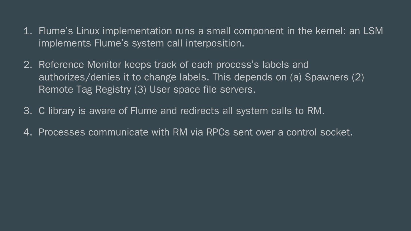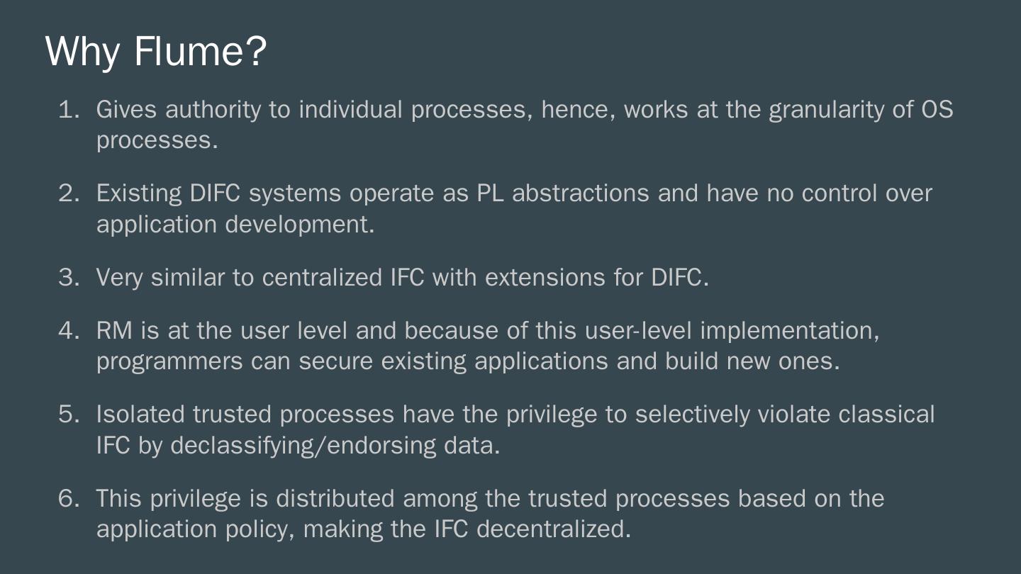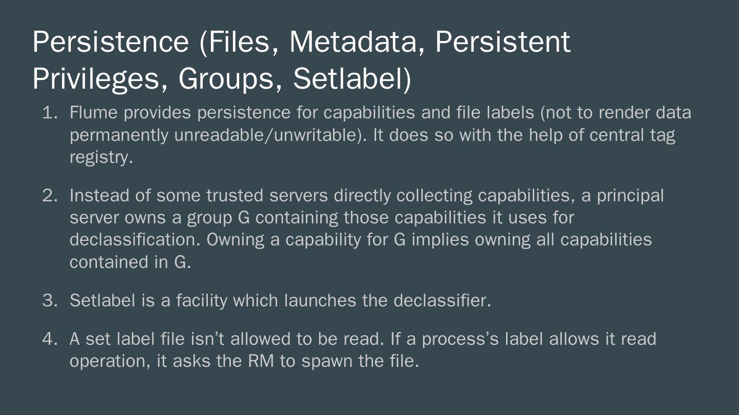 MAC vs SeLinux & Trusted BSD vs TightLip vs HiStar & Asbestos vs Jif; Why Flume? Tags, Labels, Capability; Decentralized privilege; Safe ...