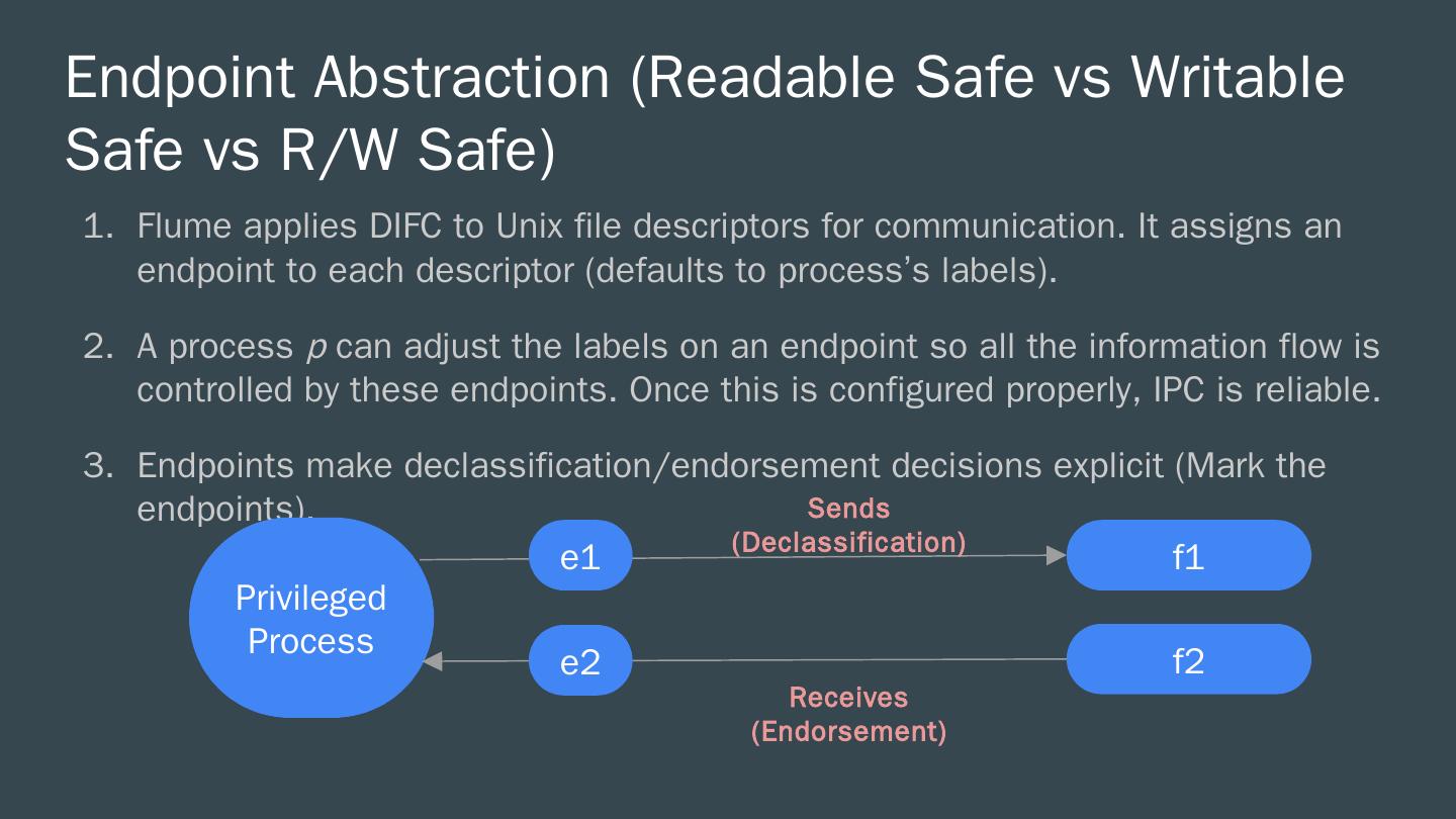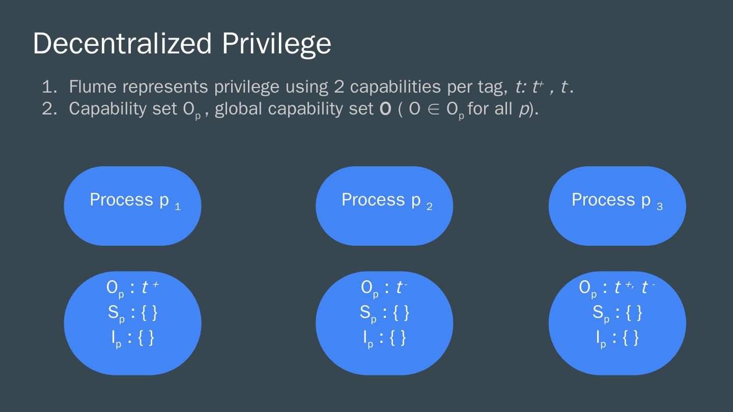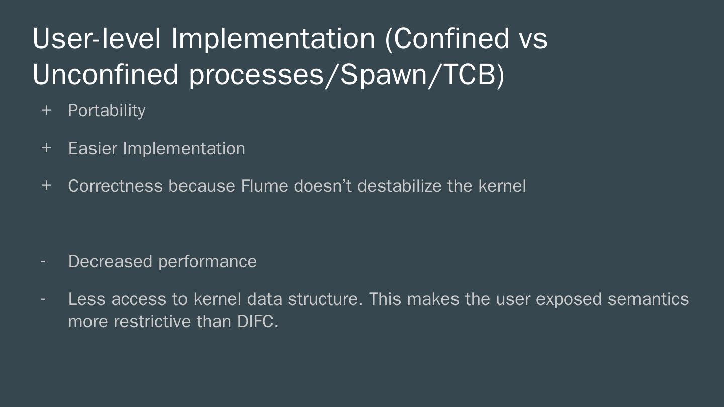 MAC vs SeLinux & Trusted BSD vs TightLip vs HiStar & Asbestos vs Jif; Why Flume? Tags, Labels, Capability; Decentralized privilege; Safe ...