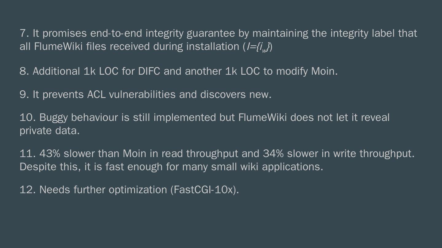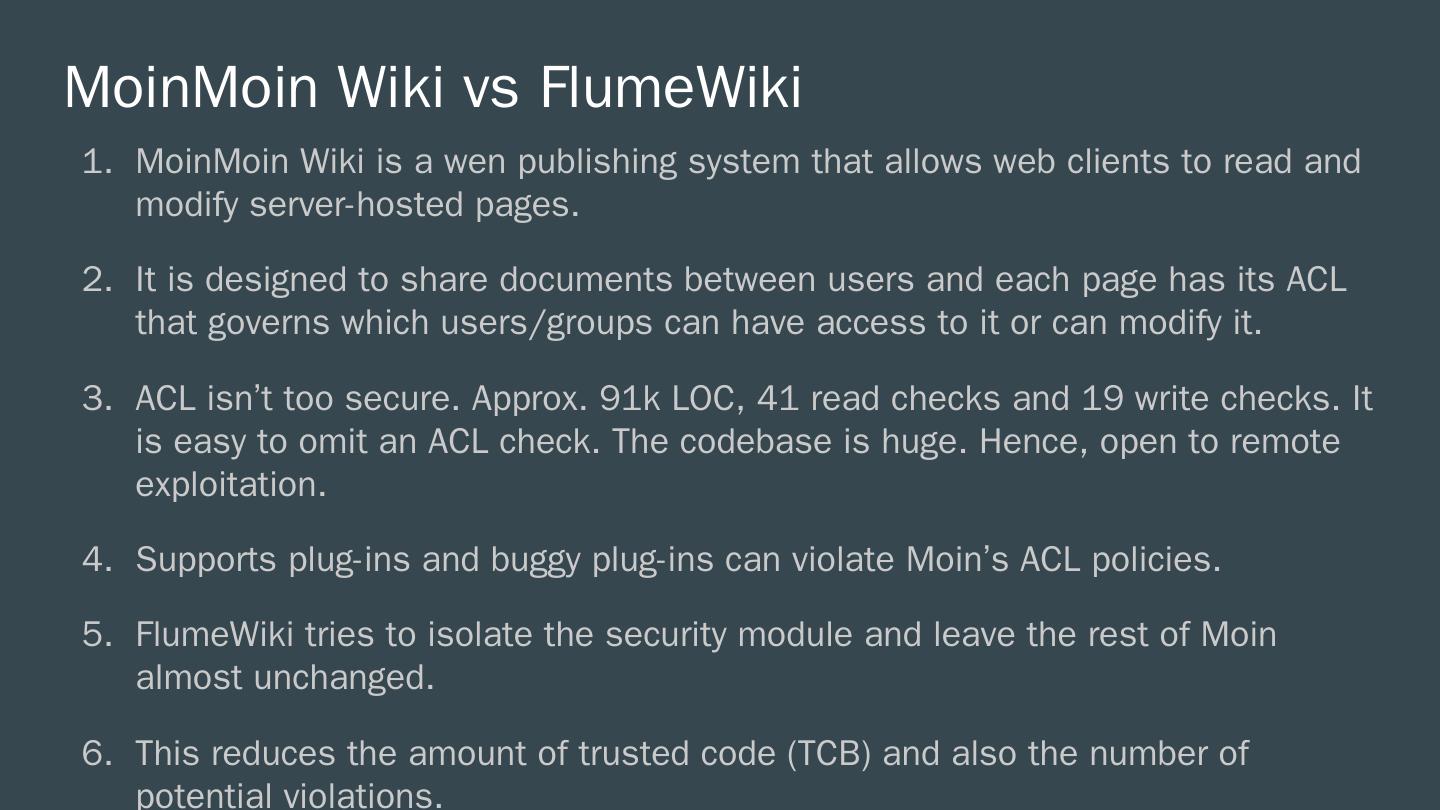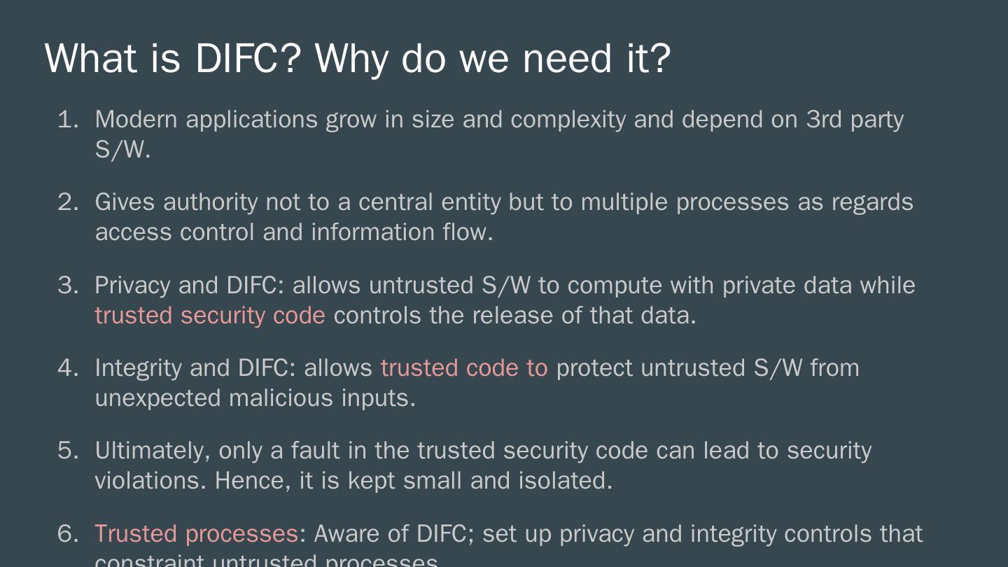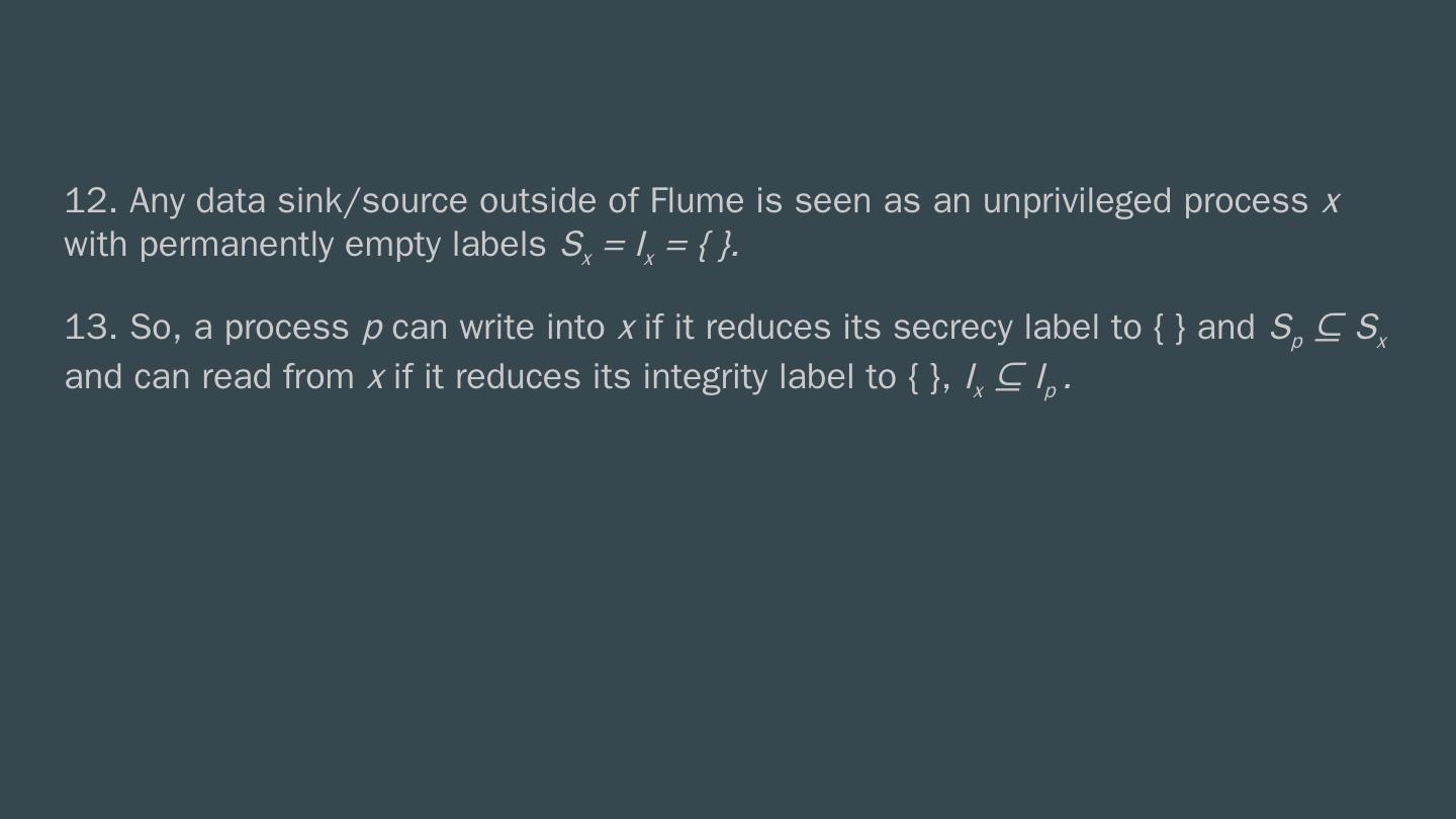 MAC vs SeLinux & Trusted BSD vs TightLip vs HiStar & Asbestos vs Jif; Why Flume? Tags, Labels, Capability; Decentralized privilege; Safe ...