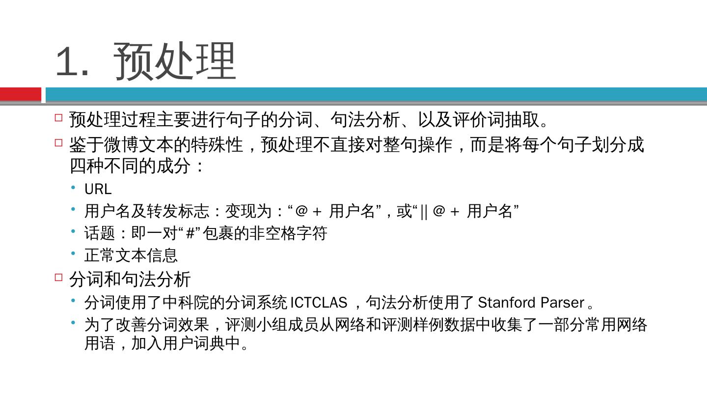 中文微博情感分析系统-LTLAB 上海交通大学中德语言技术联合 ... 预处理过程主要进行句子的分词、句法分析、以及评价词抽取。 鉴于微博文本的特殊性,预处理不 ...