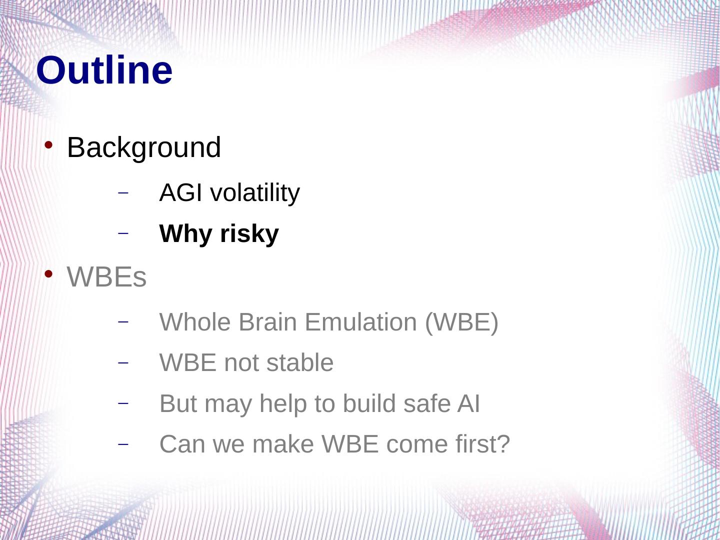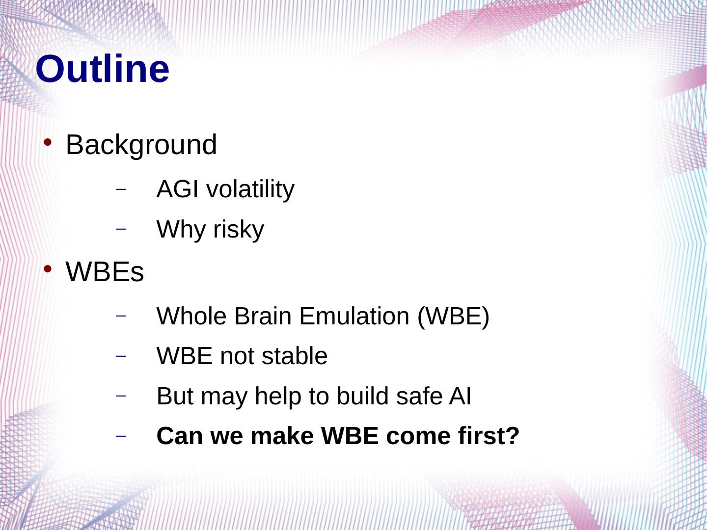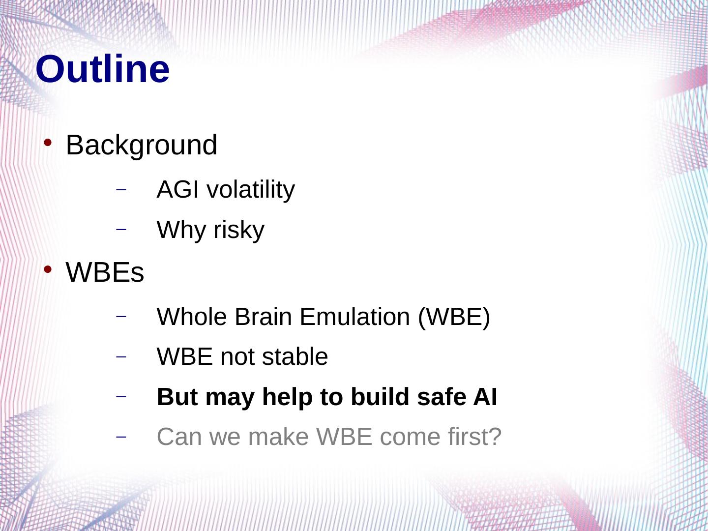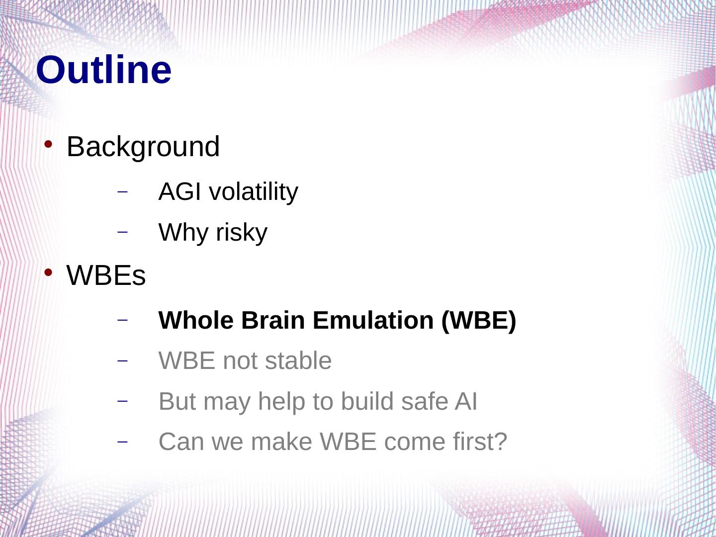 Whole Brain Emulation (WBE); WBE not stable; But may help to build safe AI; Can we make WBE come first? AGI: More change, faster. AGIs can be copied.