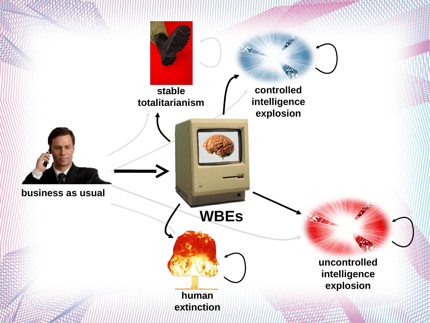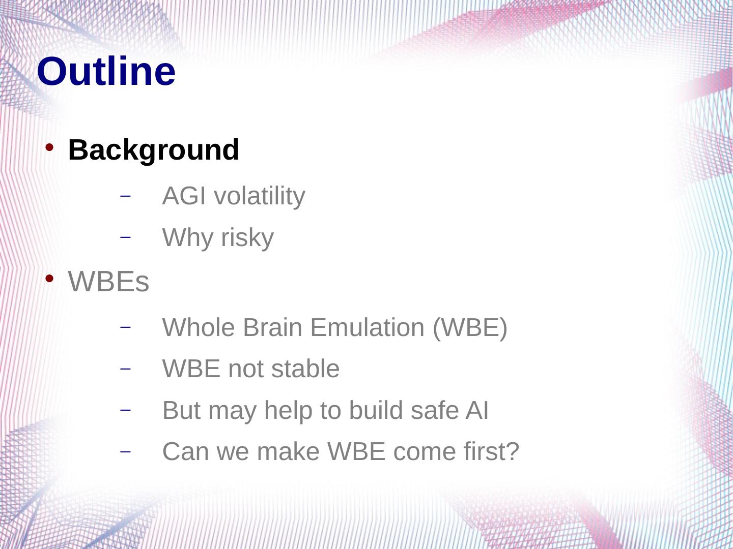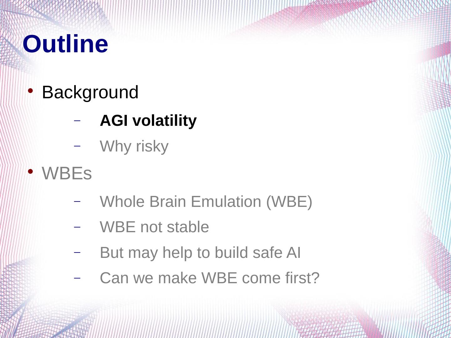 Whole Brain Emulation (WBE); WBE not stable; But may help to build safe AI; Can we make WBE come first? AGI: More change, faster. AGIs can be copied.