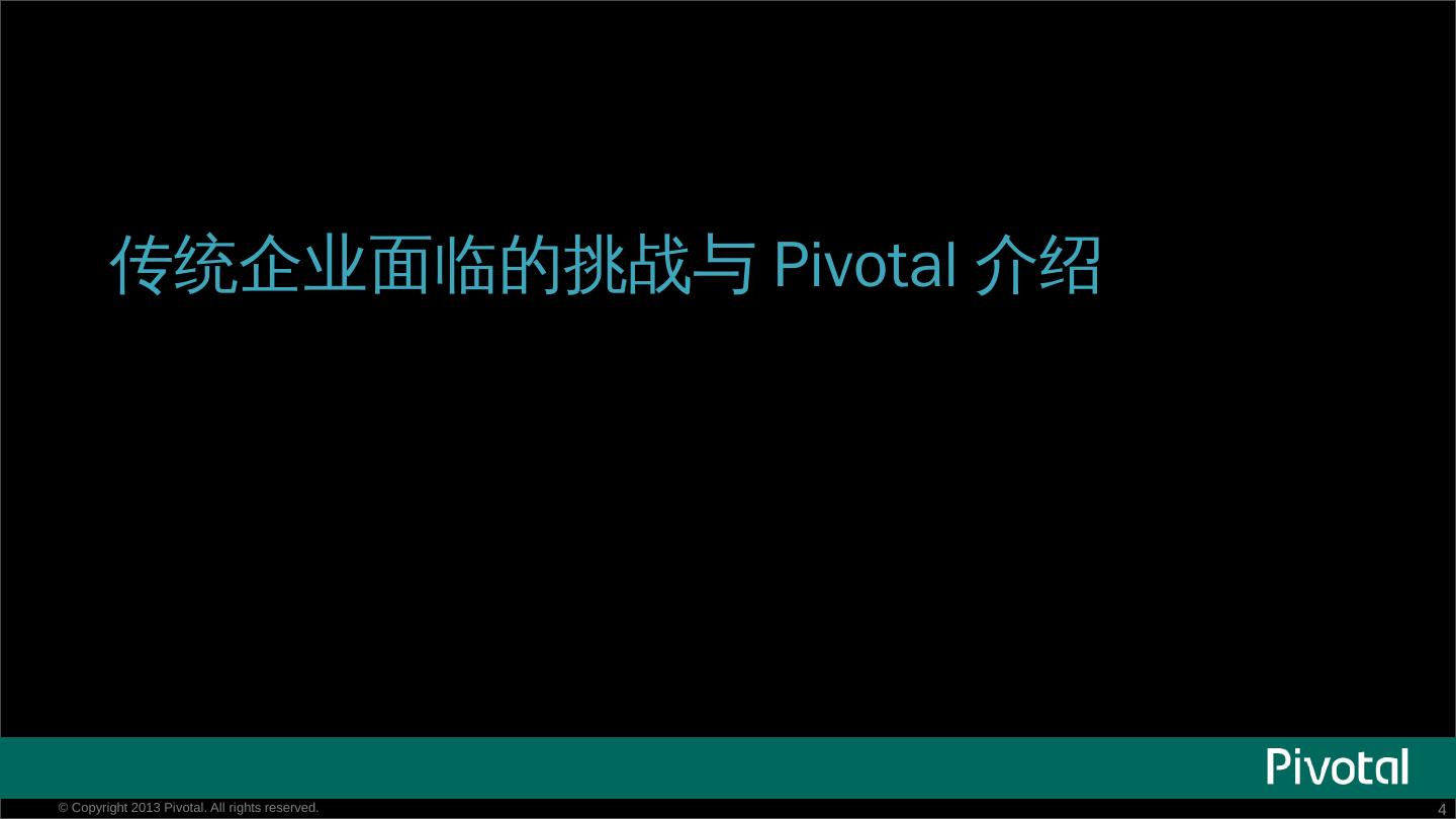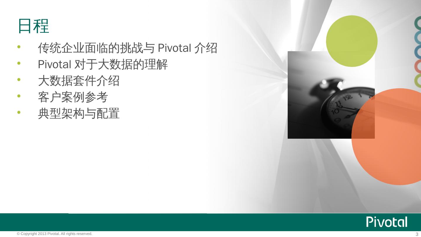 3 . 日程 传统企业面临的挑战与 Pivotal介绍 Pivotal对于大数据的理解 大数据套件介绍 客户案例参考 典型架构与配置