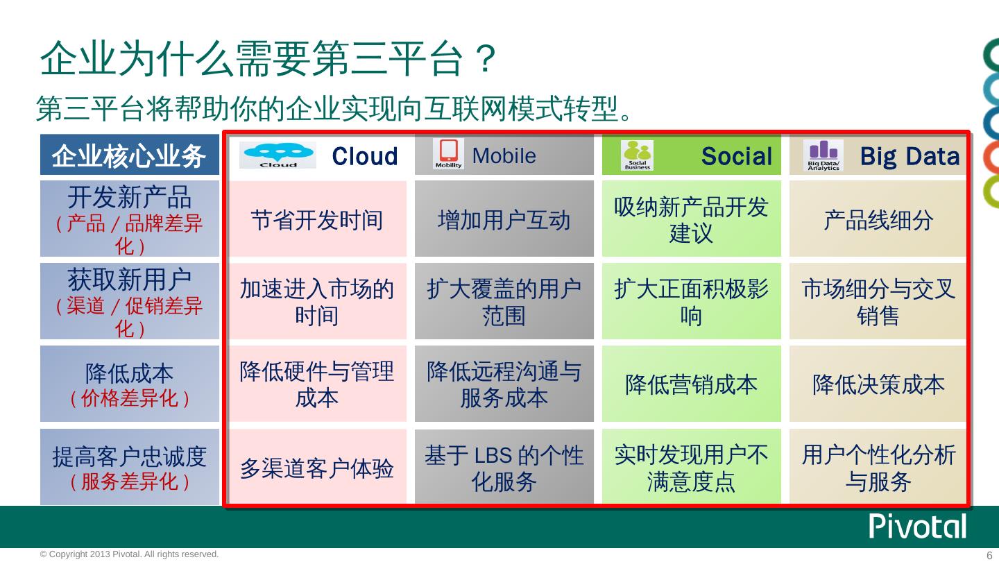 6 .企业为什么需要第三平台? 第三平台将帮助你的企业实现向互联网模式转型。 企业核心业务 Cloud Mobile Social Big Data 开发新产品 ( 产品 / 品牌差异化 ) 节省开发时间 增加用户互动 吸纳新产品开发建议 产品线细分 获取新用户 ( 渠道 / 促销差异化 ) 加速进入市场的时间 扩大覆盖的用户范围 扩大正面积极影响 市场细分与交叉销售 降低成本 ( 价格差异化 ) 降低硬件与管理成本 降低远程沟通与服务成本 降低营销成本 降低决策成本 提高客户忠诚度 ( 服务差异化 ) 多渠道客户体验 基于 LBS 的个性化服务 实时发现用户不满意度点 用户个性化分析与服务