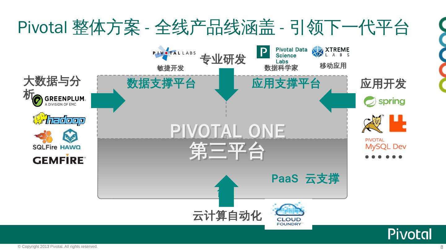7 .Pivotal的使命 独立于 EMC , VMWare 和 GE 的公司 , 但是受到各股东大力支持 使命 : 为一个崭新的技术时代构建支撑平台 把 服务于海量消费者的互联网架构与能力带给企业 首先提出并实现集成 : 新的数据支撑架构 , 现代化的开发框架与多种支撑云平台 传承自强有力的研发团队,数据科学家群体与开源精神