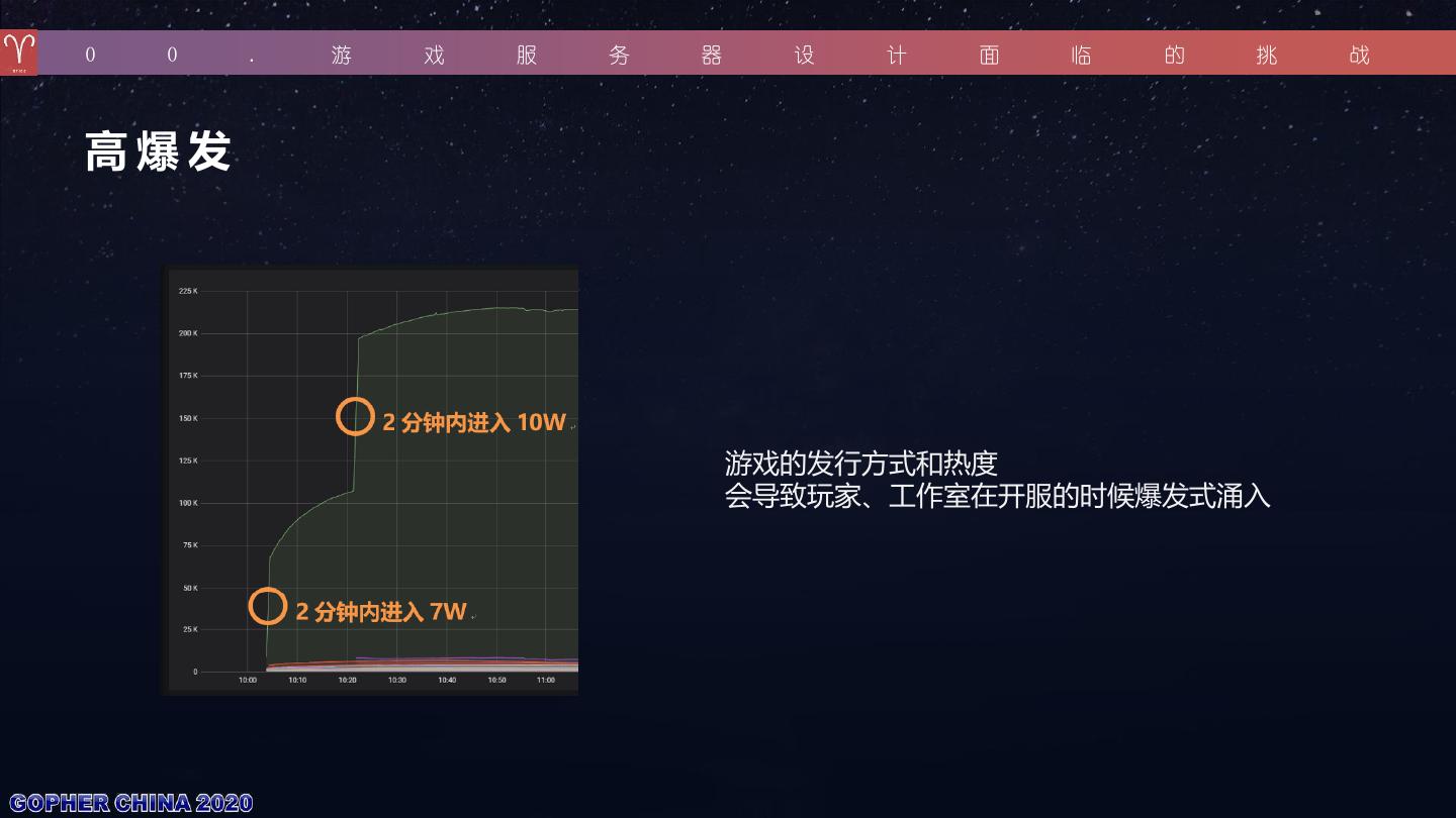 21 .0 0 . 游 戏 服 务 器 设 计 面 临 的 挑 战 高爆发 游戏的发行方式和热度 会导致玩家、工作室在开服的时候爆发式涌入