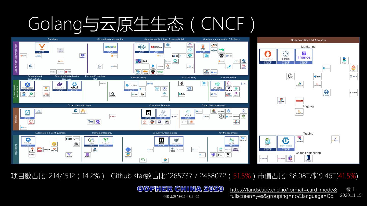 5 . Golang与云原生生态(CNCF) 项目数占比: 214/1512(14.2%) Github star数占比:1265737 / 2458072(51.5%)市值占比: $8.08T/$19.46T(41.5%) https://landscape.cncf.io/format=card-mode& 截止 fullscreen=yes&grouping=no&language=Go 2020.11.15