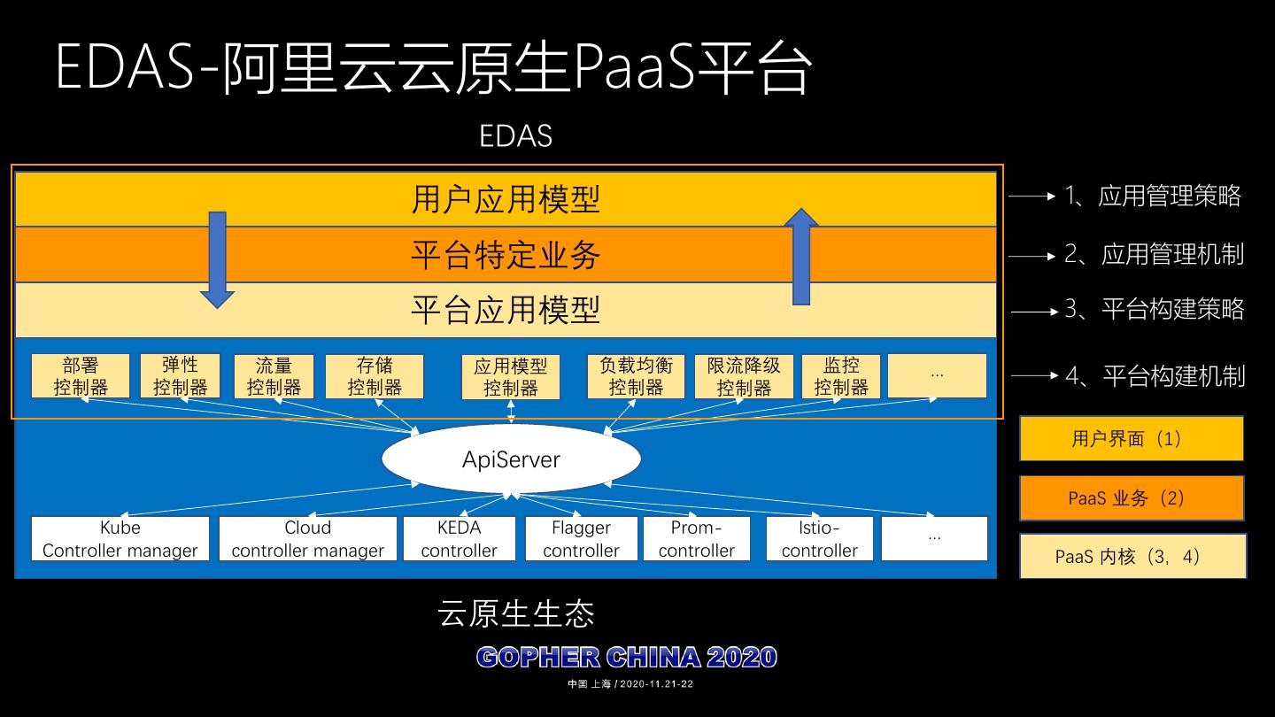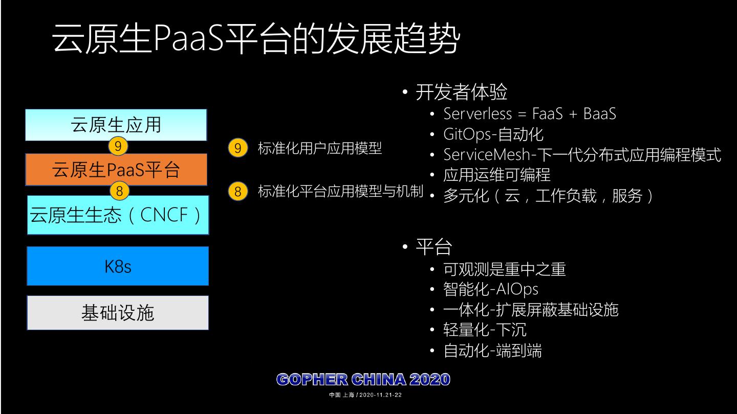 9 . 云原生PaaS平台提供应用管理策略 云原生应用 9 1 Kubectl plugins 云原生应用 云原生PaaS平台 2 Apiserver extension 8 3 Custom resources 云原生生态(CNCF) 云原生生态(CNCF) 4 Scheduler extension 1 2 3 5 1 2 3 5 5 Custom controller K8s K8s 6 Network plugins 4 6 7 4 6 7 7 Storage plugins 基础设施 基础设施 8 向下设计平台策略与机制融入云原生生态 9 向上提供应用管理策略与机制使用平台