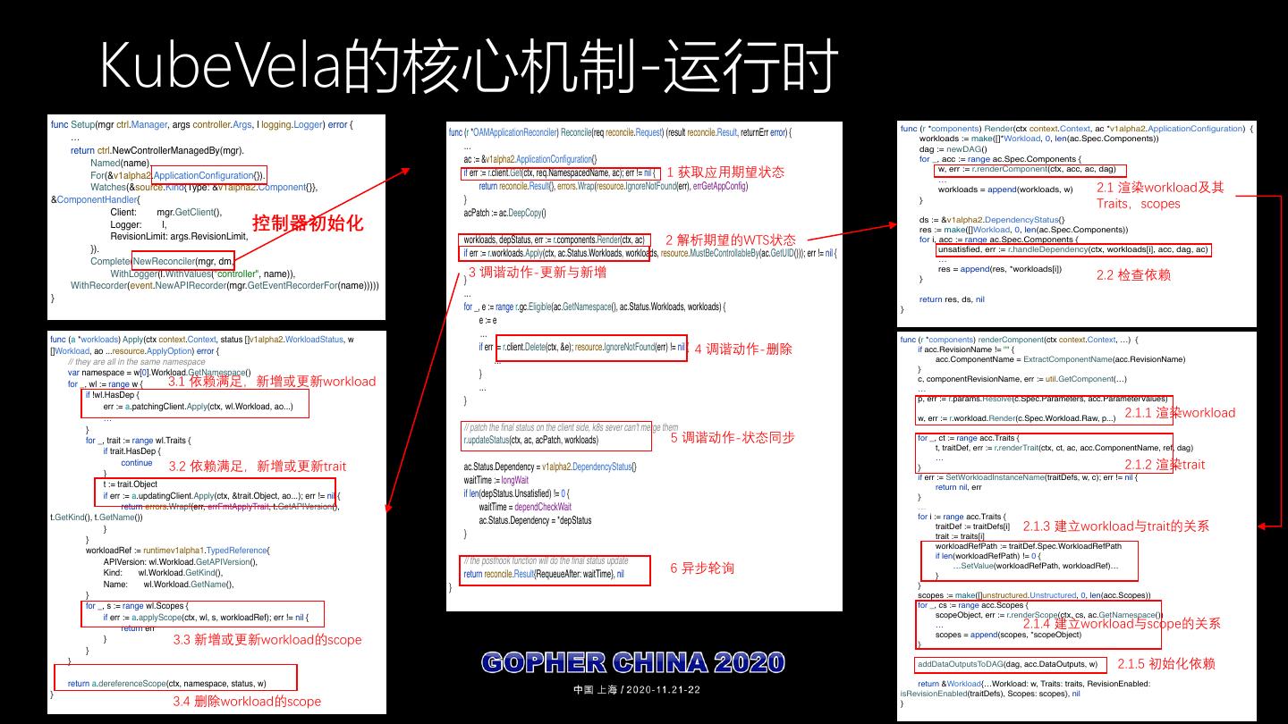 15 . KubeVela的核心机制-运行时 func Setup(mgr ctrl.Manager, args controller.Args, l logging.Logger) error { func (r *components) Render(ctx context.Context, ac *v1alpha2.ApplicationConfiguration) { func (r *OAMApplicationReconciler) Reconcile(req reconcile.Request) (result reconcile.Result, returnErr error) { workloads := make([]*Workload, 0, len(ac.Spec.Components)) return ctrl.NewControllerManagedBy(mgr). … dag := newDAG() Named(name). ac := &v1alpha2.ApplicationConfiguration{} for _, acc := range ac.Spec.Components { w, err := r.renderComponent(ctx, acc, ac, dag) For(&v1alpha2.ApplicationConfiguration{}). if err := r.client.Get(ctx, req.NamespacedName, ac); err != nil { 1 获取应用期望状态 Watches(&source.Kind{Type: &v1alpha2.Component{}}, return reconcile.Result{}, errors.Wrap(resource.IgnoreNotFound(err), errGetAppConfig) workloads = append(workloads, w) 2.1 渲染workload及其 &ComponentHandler{ } } Traits,scopes Client: mgr.GetClient(), acPatch := ac.DeepCopy() Logger: l, 控制器初始化 ds := &v1alpha2.DependencyStatus{} res := make([]Workload, 0, len(ac.Spec.Components)) RevisionLimit: args.RevisionLimit, workloads, depStatus, err := r.components.Render(ctx, ac) 2 解析期望的WTS状态 for i, acc := range ac.Spec.Components { }). if err := r.workloads.Apply(ctx, ac.Status.Workloads, workloads, resource.MustBeControllableBy(ac.GetUID())); err != nil { unsatisfied, err := r.handleDependency(ctx, workloads[i], acc, dag, ac) Complete(NewReconciler(mgr, dm, … WithLogger(l.WithValues("controller", name)), 3… 调谐动作-更新与新增 res = append(res, *workloads[i]) 2.2 检查依赖 } } WithRecorder(event.NewAPIRecorder(mgr.GetEventRecorderFor(name))))) } … return res, ds, nil for _, e := range r.gc.Eligible(ac.GetNamespace(), ac.Status.Workloads, workloads) { } e := e … func (a *workloads) Apply(ctx context.Context, status []v1alpha2.WorkloadStatus, w func (r *components) renderComponent(ctx context.Context, …) { []Workload, ao ...resource.ApplyOption) error { if err := r.client.Delete(ctx, &e); resource.IgnoreNotFound(err) != nil { 4 调谐动作-删除 if acc.RevisionName != "" { // they are all in the same namespace … acc.ComponentName = ExtractComponentName(acc.RevisionName) } var namespace = w[0].Workload.GetNamespace() } for _, wl := range w { 3.1 依赖满足,新增或更新workload … c, componentRevisionName, err := util.GetComponent(…) … if !wl.HasDep { p, err := r.params.Resolve(c.Spec.Parameters, acc.ParameterValues) err := a.patchingClient.Apply(ctx, wl.Workload, ao...) } w, err := r.workload.Render(c.Spec.Workload.Raw, p...) 2.1.1 渲染workload } // patch the final status on the client side, k8s sever can't merge them for _, trait := range wl.Traits { r.updateStatus(ctx, ac, acPatch, workloads) 5 调谐动作-状态同步 for _, ct := range acc.Traits { t, traitDef, err := r.renderTrait(ctx, ct, ac, acc.ComponentName, ref, dag) if trait.HasDep { … continue 3.2 依赖满足,新增或更新trait ac.Status.Dependency = v1alpha2.DependencyStatus{} } 2.1.2 渲染trait } if err := SetWorkloadInstanceName(traitDefs, w, c); err != nil { t := trait.Object waitTime := longWait return nil, err if err := a.updatingClient.Apply(ctx, &trait.Object, ao...); err != nil { if len(depStatus.Unsatisfied) != 0 { } return errors.Wrapf(err, errFmtApplyTrait, t.GetAPIVersion(), waitTime = dependCheckWait … t.GetKind(), t.GetName()) for i := range acc.Traits { ac.Status.Dependency = *depStatus } traitDef := traitDefs[i]2.1.3 建立workload与trait的关系 } } trait := traits[i] workloadRefPath := traitDef.Spec.WorkloadRefPath workloadRef := runtimev1alpha1.TypedReference{ if len(workloadRefPath) != 0 { APIVersion: wl.Workload.GetAPIVersion(), // the posthook function will do the final status update Kind: wl.Workload.GetKind(), return reconcile.Result{RequeueAfter: waitTime}, nil 6 异步轮询 } …SetValue(workloadRefPath, workloadRef)… Name: wl.Workload.GetName(), } } } scopes := make([]unstructured.Unstructured, 0, len(acc.Scopes)) for _, s := range wl.Scopes { for _, cs := range acc.Scopes { if err := a.applyScope(ctx, wl, s, workloadRef); err != nil { scopeObject, err := r.renderScope(ctx, cs, ac.GetNamespace()) return err … 2.1.4 建立workload与scope的关系 scopes = append(scopes, *scopeObject) } 3.3 新增或更新workload的scope } } } addDataOutputsToDAG(dag, acc.DataOutputs, w) 2.1.5 初始化依赖 return a.dereferenceScope(ctx, namespace, status, w) return &Workload{…Workload: w, Traits: traits, RevisionEnabled: } isRevisionEnabled(traitDefs), Scopes: scopes}, nil 3.4 删除workload的scope }
