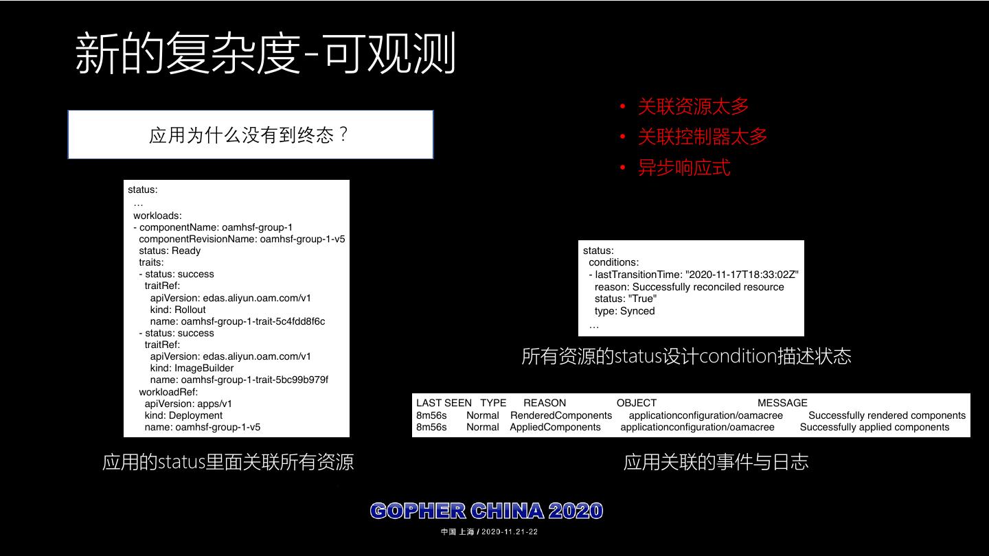 20 .新的复杂度-可观测 • 关联资源太多 应用为什么没有到终态? • 关联控制器太多 • 异步响应式 status: workloads: - componentName: oamhsf-group-1 componentRevisionName: oamhsf-group-1-v5 status: Ready status: traits: conditions: - status: success - lastTransitionTime: "2020-11-17T18:33:02Z" traitRef: reason: Successfully reconciled resource apiVersion: edas.aliyun.oam.com/v1 status: "True" kind: Rollout type: Synced name: oamhsf-group-1-trait-5c4fdd8f6c - status: success traitRef: apiVersion: edas.aliyun.oam.com/v1 所有资源的status设计condition描述状态 kind: ImageBuilder name: oamhsf-group-1-trait-5bc99b979f workloadRef: apiVersion: apps/v1 LAST SEEN TYPE REASON OBJECT MESSAGE kind: Deployment 8m56s Normal RenderedComponents applicationconfiguration/oamacree Successfully rendered components name: oamhsf-group-1-v5 8m56s Normal AppliedComponents applicationconfiguration/oamacree Successfully applied components 应用的status里面关联所有资源 应用关联的事件与日志