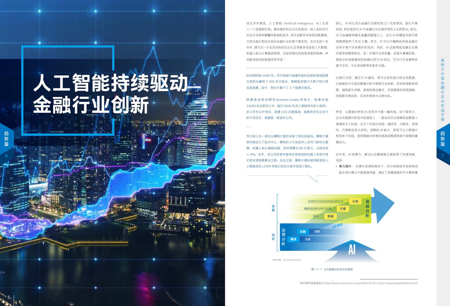 4 . 经过多年演进,人工智能(Artificial Intelligence,AI)正进 那么,AI 何以成为金融行业新的宠儿?究其原因,我们不难 入一个发展新阶段。越来越多的企业在选择这一给人类经济与 发现,其实是因为 AI 与金融行业在诸多特性上天然契合。首先, 社会生活带来颠覆性影响的技术,来开启数字化转型的新篇章。 AI 与金融都构建在海量的数据之上,这为 AI 的模型训练与预 尤其当我们把目光投向金融行业时更不难发现,在过去的十余 测推理提供了丰沃土壤;其次,AI 可以大幅降低传统金融行 年中,堪为这一行业风向标的巨头们正将更多资金投入大数据、 业用于客户关系维护的成本;同时,AI 也能帮助金融企业展 机器人和云计算服务领域,这些举措也受到投资者的热捧。来 开更多的精准狙击,进一步提升业务质量;而更为重要的是, 1 英 自新浪财经的报道这样写道 : 拥有众多创新基因的金融业务与 AI 结合,可为行业发展带来 英 特 更大空间,为业务创新带来更多可能。 特 尔 尔 人工智能持续驱动 中 时间倒回到 2000 年。华尔街投行高盛在纽约总部的美国股票 中 国 以银行为例,通过与 AI 融合,即可以依托庞大的业务数据, 国 交易柜台雇用了 600 名交易员,根据投资银行大客户的订单 金 以智能的方式驱动数据分析与预测方法创新,进而获得新的洞 金 融 买卖股票。如今,他们只剩下了 3 个股票交易员。 融 察,拥抱更为灵敏、高效的商业模式,并规避诸如贷款逾期、 行 行 金融行业创新 业 违规欺诈等风险,在未来竞争中占得先机。 业 根 据 美 国 财 经 媒 体 Business Insider 的 统 计, 高 盛 目 前 AI AI 实 33000 名全职员工中,超过 9000 名员工是程序员和工程师。 实 战 近几年在公开场合,高盛 CEO 反复强调,高盛的定位已经今 然而,从数据分析到 AI 应用并不能一蹴而就。如下图所示, 战 手 手 时不同往日,高盛是一家技术公司。 企业在数据分析技术的演进上,一般会经历在规模和成熟度上 册 册 递增的五个阶段。这五个阶段分别是:描述性、诊断性、预测 …… 性、方案制定和认知性。成熟的 AI 能力,适用于以上数据分 趋 实 华尔街上另一家巨头摩根大通也采取了类似的做法。摩根大通 析的各个阶段,是把数据分析推向更高成熟度和更大规模的重 趋 战 势 势 很早就设立了技术中心,聘用约 4 万名技术人员专门研究大数 要动力。 篇 篇 据、机器人和云基础设施,技术预算达 96 亿美元,占其总收 入 9%。去年,该公司还宣布使用全球首创的机器人来进行他 近年来,AI 的算力、算法以及数据能力都获得了快速突破, 6 7 们的全球股票算法交易。在此之前,摩根大通在欧洲研发的人 包括: 工智能项目 LOXM 早就已经在交易中尝到了甜头。 • 算力提升: 在摩尔定律的推动下,芯片制程技术和架构创 新正使计算力不断取得突破,满足了机器智能对于计算密集 自我学习与完全自动化的企业 认知 高 发 级 展 模拟驱动的分析与决策 方案 分 预见 预测 析 曲线 分析 运 诊断 洞察 现 营 状 分 描述 反思 析 资料来源:Forrester Research 图 1-1-1 企业数据分析技术的演进 1 相关媒体报道请参见 http://finance.sina.com.cn/world/2018-05-22/doc-ihawmaua4464623.shtml 6