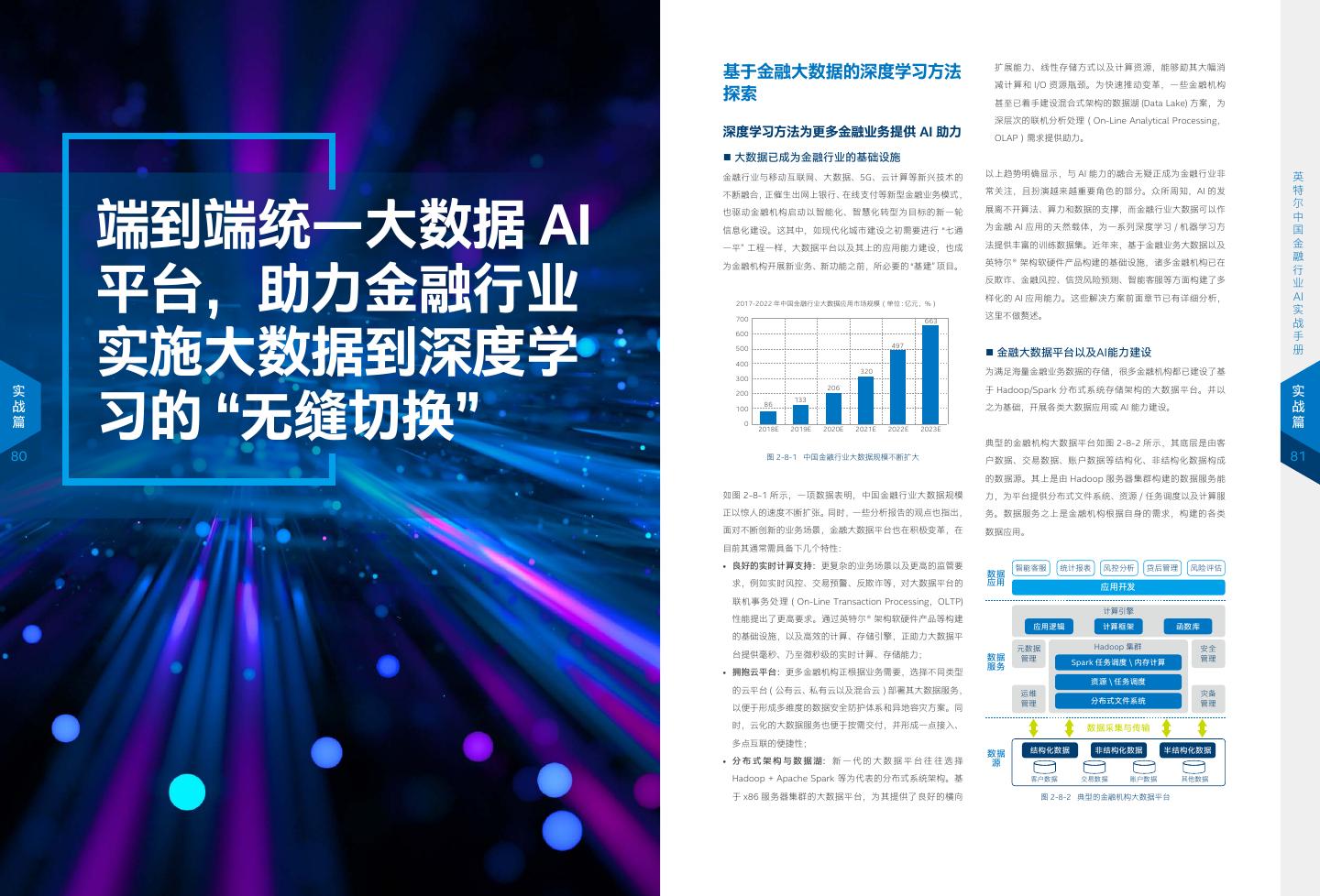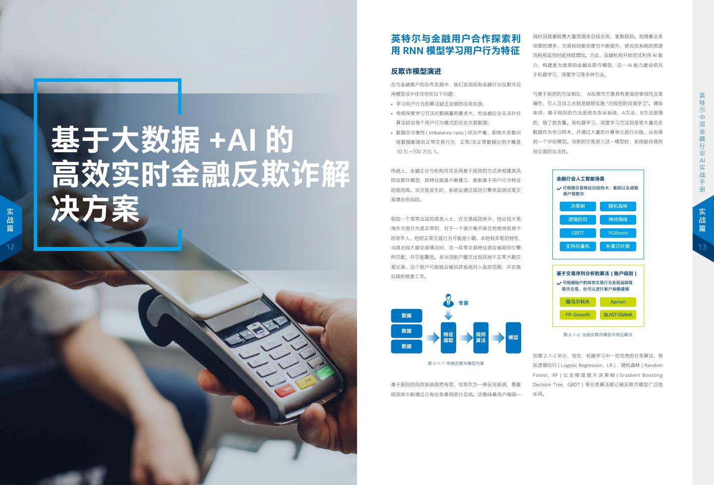 5 . 型算法的需求。例如,通过人工神经网络进行深度学习的概 本地的前提下,安全合规接入多方数据。进而,一方面帮助用 通过引入联邦学习等新的联合学习方法,AI 可以横向聚合更 如下图所示,风险与合规主要包括了应对欺诈风险、信用风险、 念已经存在了至少 20 年,但直到最近几年,当计算技术提 户以多源多维度的用户行为数据,来提供个性化定价策略;另 多的训练数据来提升模型精度,从而带动跨地域、跨领域的企 宏观风险、反洗钱以及合规政策文件分析等,AI 技术应用主 升到能够满足 AI 所需的高精度、高速度的运算能力时,将 一方面,通过多源的安全大数据,有效识别恶意骗保行为。一 业级数据合作,以 “合作共赢” 的方式使各参与方都能从不断 要涉及机器学习、基于深度学习的人脸识别和语音识别以及知 这些计算密集型算法付诸实践应用才成为可能。 些数据表明,基于联邦学习方法建立的保险数据模型具有更丰 提升的 AI 能力中获益。 识图谱等。客户体验主要包括智能投顾、智能理赔、智能客服、 富的风险特征体系,可使行业定价准确率获得大幅提升。 身份识别、农牲识别等,AI 技术应用主要涉及基于深度学习的 • 创新推动:AI 发展仅靠计算力和数据来推动,还是远远不 在后端,比如在行业的合规以及 IT、财务等支持职能中,存在 人脸识别和语音识别、行为模式识别、NLP 以及机器人技术等。 英 够的。驱动其向应用迈进的关键动力,毫无疑问是创新,正 通过以上算力、算法和数据处理技术进步, AI 正成为金融企 大量高度重复性的工作。AI 的重要应用之一,正是要逐步接 营销决策主要包括客户画像、精准营销、智能推荐、征信评分、 英 特 是它推动 AI 跨越了从研究到主流使用的临界点。实践已经 业开展高质量数据分析和业务预测的重要手段。得益于 AI 技 手这些重复性的工作。所以,AI 在后端支持流程中,也存在 资金流向监控以及量化分析等,AI 技术应用主要涉及深度学习、 特 尔 证明,每一次 AI 算法的创新,都预示着更多的应用可能性, 术的不断发展,在金融行业的前端、中台和后端,都已经有了 大量应用机会和潜力。 机器学习等。智慧运营主要包括网点智能布局、单据识别、智 尔 中 中 国 并吸引更多的创新者加入到应用开发行列中来。比如,20 相对成熟的应用方案。 能运维等,AI 技术主要涉及基于深度学习的图像识别、知识 国 金 世纪 90 年代的神经网络创新,驱动了对 AI 的重新阐述和 总之,围绕着前、中、后三端的 AI 能力,金融行业中的 AI 应 图谱等。 金 融 研究,并在 2009 年和 2012 年,分别在语音识别和图像识 在前端,感知类技术(计算机视觉、语音识别、自然语言处理 用场景众多,目前主要聚焦在风险 & 合规、客户体验、营销 融 行 行 业 别等领域获得了突破性进展,这也成为当前 AI 创新发展的 等)不断走向成熟,有代表性的应用已有客服聊天机器人、自 决策和智慧运营四个方向。 业 AI 催化剂。 动身份识别等。 AI 实 实 战 风险 & 合规 客户体验 营销决策 智慧运营 战 手 同时,数据洪流的到来,也驱动金融行业 AI 迎来高速发展浪潮。 客服聊天机器人能够遵循与客户交互的标准路径,借助机器 手 欺诈风险 智能投顾 客户画像 网点智能布局 册 一方面,物联网 (IoT)的广泛应用、智能互联设备的快速普 学习算法,观察对话并理解客户的意图,在遇到困难时将问 册 及,带来了越来越多的结构化和非结构化数据。有研究表明, 题发送给人工处理,并对人工答复加以学习,从而持续提升 信用风险 智能理赔 (车险 / 医保) 精准营销 单据识别 到 2020 年,物联网中智能、互联设备产生的数据可达 40 ZB 客户服务质量、降低服务成本。而自动身份识别则是通过语 趋 宏观风险 智能客服 资金流向监控 智能运维 趋 势 (1ZB=10 万亿亿字节)2。如此海量的数据,无疑为金融领 音识别、面部识别等方式,分析用户声音、眼部、面部特征, 势 身份识别 篇 域 AI 算法的训练,以及发掘全新洞察奠定了基石。另一方面, 对用户进行身份验证。此类 AI 验证方法比原来的安全问题或 反洗钱 (人脸,声纹) 量化分析 篇 面向不同类别金融数据的处理和运用,也出现了更多的方法论 密码验证效率更高,而且无需用户默记密码,可让客户体验 合规政策文件分析 农牲识别 8 和硬件产品。例如,面对金融数据普遍的高维特性,企业已经 大为改善。 9 可以选择更有针对性的高维算法、高性能实时特征数据库,以 图 1-1-2 金融行业人工智能应用场景 及具有更好落盘性能和更高容量的存储设备来构建 AI 应用, 在中台,AI 可以提高基于信息的分析决策效率,帮助用户更加 降低 TCO 并提升处理效能。 快速地抓住商机。既有的商业智能(Business Intelligence, BI)和传统的数据分析方法,往往停留在趋势分析、原因挖掘、 值得一提的是,虽然高质高量的数据能给 AI 核心竞争力带来 数据挖掘与预测层面。而 AI 的引入,既延伸了分析的广度, 巨大提升已成为共识,但在金融行业,为了规避数据泄露风险, 也提高了分析的深度。AI 可以通过不断学习和完善,提高建 企业往往会构建一系列严密的防护措施,由此也引发了严重的 议的相关性和特异性,实现 “个性化分析”,为风险管理、营销、 数据孤岛问题。为了让多源数据的交互、传输和聚合更具安全 服务等提供基于智能化的分析和决策。 