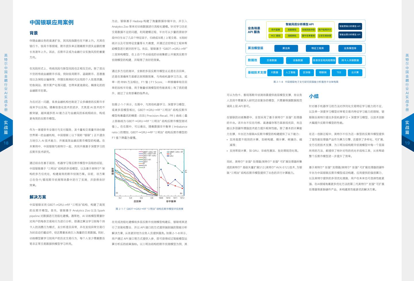 10 . 中国银联应用案例 为此,银联基于 Hadoop 构建了海量数据存储平台,并引入 智能风控分析模型 API 智能营销分析模型 API Analytics Zoo 等来对训练数据进行流程化建模。针对学习历史 业务场景 伪卡盗刷 恶意套现 洗钱风险评级 商户信用评分 背景 交易数据不足的问题,利用建模过程,平台可从少量的原始字 API 服务 MCC 套码 违规移机 黄牛名单查询 公安交易协查 智能运营分析模型 API 段中衍生出了几百个特征因子,归纳成当笔 / 上笔交易、长短时 伴随金融业务的高速扩张,其风险指数也在不断上升。尤其在 统计以及可信特征变量等 6 大维度,并通过这些特征工程来帮 银行卡、信用卡等领域,欺诈损失率正随着欺诈损失金额的增 助模型进行更好的学习。而后,银联基于 “GBDT—>GRU—>RF” 算法模型层 算法库 特征工程库 业务模型库 长而逐年上升。因此,反欺诈正成为金融行业实施风控的重要 英 三层架构模型,在上百个节点组成的训练集群上开展其反欺诈 英 方向。 特 侦测模型的构建,并取得了良好的效果。 数据池 交易数据 设备数据 信息安全和风险情报 持卡人关联数据 特 尔 尔 中 在风险形式上,传统风险与新型风险也正相互交织。除了层出 中 国 通过多方位的测评,全新的多层反欺诈模型无论是在召回率, 国 不穷的传统金融欺诈手段,例如信用欺诈、盗刷欺诈、恶意套 基础技术支撑 大数据 人工智能 区块链 物联网 TEE 云计算 金 还是在准确率方面都达到预期效果,与传统机器学习方法,或 金 融 现以及保险业骗保等,伴随互联网时代出现的个人信息泄露、 融 单一的 RNN 方法相比,F1 值(F1 Score,一种准确率和召回 图 2-1-8 中国银联电子支付研究院智能分析服务平台架构图 行 钓鱼网站、欺诈黑产化等问题,也带来更高频化、精准化的的 行 业 率的加权平均值,用于衡量侦测模型的性能表现)有了质的提 业 金融欺诈犯罪。 AI 升,超过了业务部署的临界点。 AI 实 可以为伪卡、套现等欺诈侦测场景提供底层模型支撑,而业务 小结 实 战 为应对这一问题,各类金融机构也制定了众多缜密的反欺诈手 人员则不需要深入研究这些复杂的模型,只需要根据数据规范 战 手 如图 2-1-7 所示,左图中,与其他机器学习、深度学习模型, 手 段来予以反制。随着信息化技术的进步,尤其是 AI 技术的不 调用上层 API 即可。 针对基于机器学习的方法对序列化交易特征学习能力的不足, 册 或者多层模型相比,GBDT—>GRU—>RF “三明治” 结构反欺诈 册 断突破,越来越多的 AI 能力正与金融风控系统相结合,构成 以及单一深度学习模型对单笔交易内特征学习能力的限制,银 模型有着最优的精度 - 召回(Precision–Recall,PR)曲线(最 更有效的反欺诈模型。 在银联的训练集群中,全部采用了基于英特尔® 至强® 处理器 联联合英特尔提出多层机器学习 + 深度学习模型,以技术创新 上部曲线为 GBDT—>GRU—>RF “三明治” 结构反欺诈模型测试 实 的平台。该平台不仅在内核、高速缓存等方面表现优异,而且 大幅提升反欺诈模型的性能。 实 战 值)。在右图中,可以看出,随着数据非平衡率(Imbalance 战 作为一家提供专业银行与支付服务,发卡量和交易量市场份额 能以多项硬件增强技术助力提升框架性能。除了基本的计算能 篇 ratio)的增加,GBDT—>GRU—>RF “三明治” 结构反欺诈模型的 力支撑,平台还为银联AI反欺诈模型的构建提供了以下能力: 在这一创新过程中,英特尔不仅为这一新型的反欺诈模型提供 篇 世界第一的金融机构,中国银联(以下简称 “银联”)正不遗余 F1 值下降最为缓慢。 力地引入 AI 技术能力,开展高效金融反欺诈模型的构建。在 • 支持高度不规则的计算,如树构建、熵计算、树遍历、缩 了高性能处理器产品作为算力引擎,还提供了多样化、可扩展、 18 减等; 全方位的技术支撑,为三明治结构欺诈侦测模型中每一个层面 19 本案例中,中国银联与英特尔一起,共同开展基于深度学习的 反欺诈技术研究。 GBDT—>GRU—>RF GBDT—>GRU—>RF • 支持常规计算,如 GRU、非线性激活、批处理规范化等。 所用的方法,都提供了有针对性的优化手段和工具,从而帮助 GRU—>GBDT+RF RF GBDT+RF—>GRU GRU GRU 整个反欺诈模型进一步提升了效率。 GBDT+RF 通过结合在基于规则、机器学习等反欺诈模型中汲取的经验, GBDT 同时,英特尔® 至强® 处理器/英特尔® 至强® 可扩展处理器所集 RF SVM 中国银联基于 “三明治” 结构的多层模型,以及基于英特尔® 架 LR 成的英特尔® 高级矢量扩展512(英特尔® AVX-512)技术,为银 基于英特尔® 至强® 处理器/英特尔® 至强® 可扩展处理器的硬件 准确率 F1 构的多方位优化,构建高效的欺诈侦测方案。目前,该方案 联 “三明治” 结构反欺诈模型提供了出色的并行计算能力。 平台为中国银联反欺诈模型成功构建、应用提供的强劲算力, 已在伪卡/套现欺诈侦测等场景中进行了实测,并获得良好 以及英特尔提供的多项优化措施,用户在未来也可选择性能更 效果。 强、在AI领域有着更多优化方法的第二代英特尔® 至强® 可扩展 处理器等更新硬件产品,来构建其性能更优的解决方案。 (a) (b) 解决方案 0.2 0.4 0.6 0.8 1609 1610 1611 1612 召回率 非平衡率 中国银联采用 GBDT—>GRU—>RF “三明治”结构,构建了高效 图 2-1-7 GBDT—>GRU—>RF “三明治” 结构反欺诈模型评估效果 的 反 欺 诈 模 型。 首 先, 银 