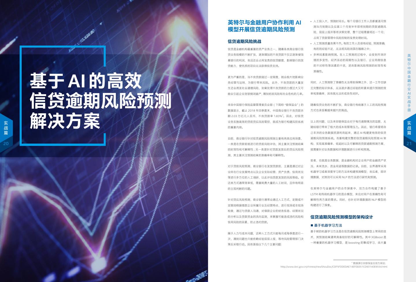 11 . 英特尔与金融用户协作利用 AI • 人工投入大,预测时间长。每个月银行工作人员都要逐月预 测当月到期以及后面三个月到半年即将到期的贷款逾期风 模型开展信贷逾期风险预测 险,层层上报并等待决策处理,整个过程需要将近一个月; 占用了贷款管理中风险控制的宝贵处理时间。 信贷逾期风险挑战 • 人工预测质量良莠不齐。有的工作人员很有经验,预测准确; 信贷是金融机构最重要的资产业务之一,随着各类商业银行信 有的则经验不足,无法将风险消弭在襁褓之中; 英 贷业务规模的不断扩张,逐渐增加的不良贷款不仅正逐渐侵蚀 • 多种因素影响预测。在人工预测的过程中,会受到市场环 英 特 着银行的利润,而且还会占用宝贵的信贷额度,影响银行的放 境的多变性、经济活动的周期性以及银行、企业两侧信息 特 尔 贷能力,使优质的项目无法获得信贷支持。 的不对称性等因素的干扰,进而影响风险预测的时效性和 尔 中 中 准确性。 基于 AI 的高效 国 国 金 更为严重的是,当不良贷款超过一定限度,就会极大地影响业 金 融 务经营与运转,为银行带来风险。 此外,不良贷款的大量发 同时,人工预测除了准确性无法得到保障之外,这一工作也缺 融 行 行 业 生还会诱发社会道德风险,如果处理不良贷款的力度过大又可 乏完整的知识体系,无法逐步通过经验的积累来提升预测的效 业 信贷逾期风险预测 AI 能会引起企业连锁倒闭破产,增加财政风险和社会危机的几率。 率和准确率,因而就无法形成良性闭环。 AI 实 实 战 战 手 来自中国银行保险监督管理委员会银(下简称 “银保监会”)的 随着信贷业务的不断扩张,商业银行传统基于人工的风险预测 手 册 数据显示,截止 2018 年四季度末,中国商业银行不良贷款余 方式也承受着越来越大的挑战。 册 解决方案 额 2.03 万亿元人民币,不良贷款率 1.83%4。因此,对信贷 业务实施高效的贷前贷后风险管控,就成为银行构建风控系统 以上的问题,以及来自银保监会对于每月逾期情况的监察,无 实 实 战 的重要内容。 疑给银行带来了极大的成本和管理压力。因此,银行希望将自 战 篇 己丰沛的业务数据资源利用起来,通过 AI 构建更有效的信贷 篇 目前,商业银行针对信贷逾期风险预测主要有两类应用场景, 逾期风险预测系统。而要构建完整的信贷逾期风险预测 AI 架 20 一类是在贷款前就进行的贷前风险评估,其主要关注预测结果 构,实现高准确率、低延时以及可解释的贷款逾期预测方案, 21 的时效性和可解释性 ; 另一类是针对贷款发放后的贷后风险预 就需要针对业务数据和环境数据进行分析和预测。 测,其主要关注预测结果的准确率和可解释性。 前者,也就是业务数据,是金融机构对企业用户的金融资产状 对于贷前风险预测,商业银行在发放贷款前,主要是通过对企 况、未来流水、资金用途等数据的记录。目前,业界通常采用 业所在行业发展特点以及企业实际经营、资产负债、信用状况 机器学习或者深度学习的方法来构建预测模型;而后者,即环 等进行多方位的人工调研,以此评估贷款发放的风险等级。但 境数据,对其则可以采用 NLP 的方法进行研究和预测。 这类方式通常效率低,需要耗费大量的人工时间,且伴有明显 的主观判断的问题。 在英特尔与金融用户的合作探索中,双方合作构建了基于 LSTM 和传统机器学习的混合模型,来应对用户在准确性和可 针对贷后风险预测,商业银行通常会通过人工方式,定期或不 解释性两方面的需求。同时,也针对环境数据的 NLP 模型的 定期地根据借款企业所属行业及经营特点,进行现场或非现场 构建进行了探索。 检查,通过与贷款人沟通,对借款企业的财务信息、经营状况 的分析以及贷款资金的流向监测,来掌握可能造成违约风险和 信贷逾期风险预测模型的架构设计 信用风险的因素,防止违约贷款。 ■ 基于机器学习方法 基于树的机器学习方法是在信贷逾期风险预测模型上常用的技 囿于人力与成本问题,这种人工方式只能每月或每季度进行一 术,其预测结果通常具备较好的可解释性。其中 XGBoost 是 次,遇到问题也只能依赖经验层层上报,等待风险管理部门决 一种重要的机器学习模型,是 boosting 的集成学习,由大量 策后采取行动。因而面临以下几个主要问题: 4 数据源引自银保监会官方网站: http://www.cbrc.gov.cn/chinese/newShouDoc/CDF5FDDEDAE14EFEB351CD93140E6554.html