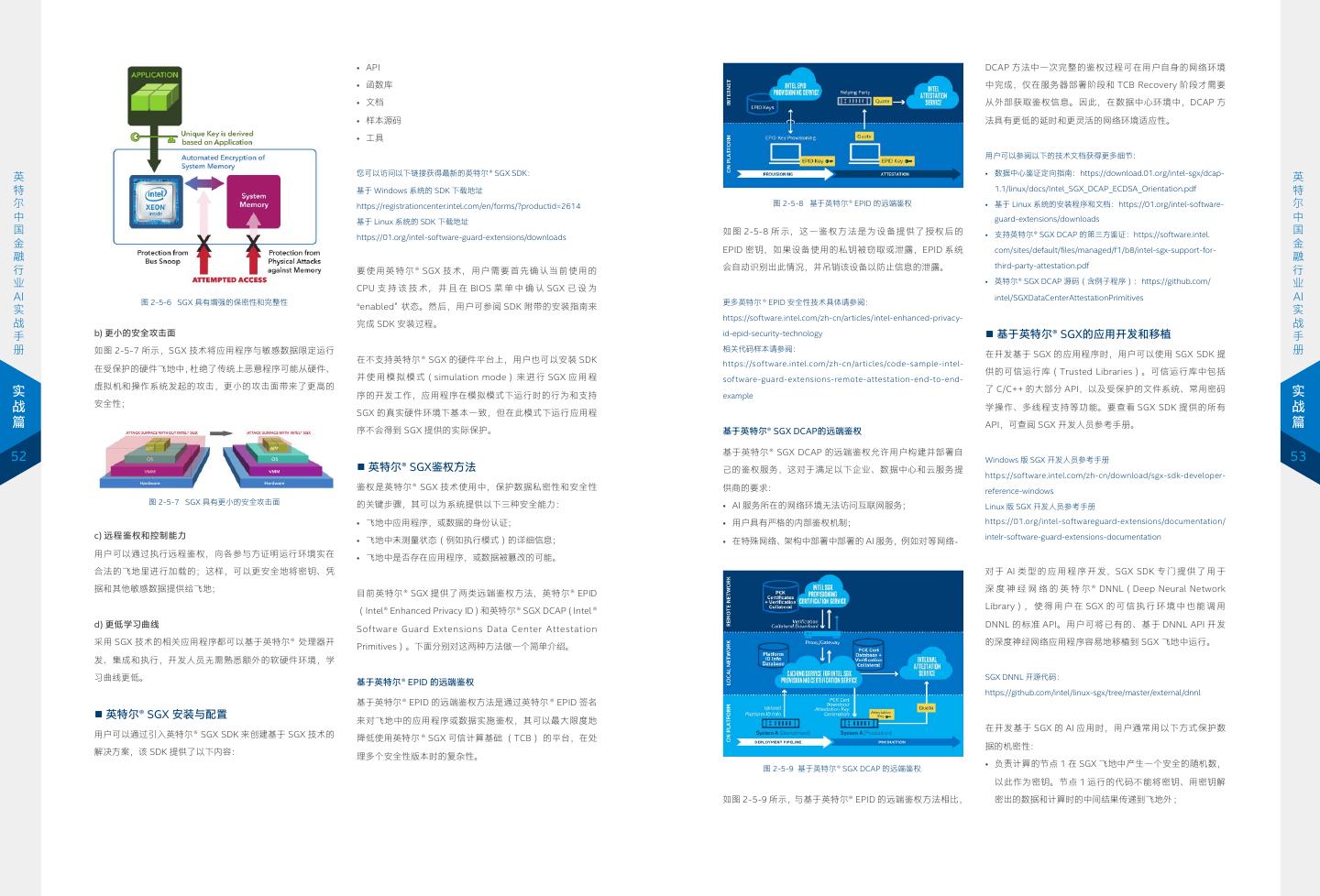 28 . • 节点 1 使用一种远端鉴权方式,产生报告证明自己的软硬 要工程师拥有娴熟的英特尔® SGX 移植技巧和经验,同时还需 ■ 支持英特尔® SGX 技术的处理器 除此之外,英特尔也正计划在更多处理器平台,例如至强系列 件环境是安全的。然后,节点 1 向另一个提供数据或梯度 要工程师能够对进行移植的应用程序(如开源框架、算法实现 值得一提的是,随着金融行业中,基于云服务(包括公有云、 处理器中加入英特尔 ® SGX 技术,帮助用户更便捷地部署基于 的节点 2 发送数据请求 ; 等)的源代码保持相当的熟悉度,而在一些金融企业中,许多 私有云和混合云)的 AI 应用变得愈来愈广泛,而既有云服务 硬件增强的安全机制,从而推动联邦学习等方法在 AI 领域的应 • 节点 2 验证节点 1 的报告,确定节点 1 是安全的。同时, 应用的开源框架或算法实现都已经有了较长历史,因此源代码 器硬件设备未必全部支持英特尔® SGX 技术,这给企业使用 用与发展。 节点 2 用其他方法确定节点 1 有权访问该数据 ; 修改移植的工作量会非常巨大。 SGX 技术带来了障碍。企业要么需要耐心等待下一个硬件更 • 节点 2 用节点 1 提供的密钥加密数据并发送,供节点 1 解 新周期,要么需要付出额外的采购成本。为解决这一难题,英 基于英特尔® SGX 的解决方案 英 密后使用。 为减少上述应用程序移植的工作量,避免用 C/C++ 语言重 特尔正逐步在其处理器中集成 SGX 技术,为用户提供了快速 英 特 新编写这些代码,用户可选择使用一些支持英特尔 ® SGX 的 部署 SGX 技术的能力。 ■ 1+N 式多源数据 AI 模型训练解决方案 特 尔 以联邦学习为例,使用以上方式进行设计,一个联邦学习应 Library OS 来运行这些已有的代码,例如 Graphene (https:// 借助英特尔 ® SGX 技术,金融企业可以根据自身的实际情况构 尔 中 中 用可以在 SGX 中实现以下工作流程: github.com/oscarlab/graphene)、Occlum、Scone、 建多样化的解决方案。下文将简单介绍一种基于英特尔® SGX 国 英特尔® 至强® E-2200 处理器是英特尔旨在帮助企业构建高效 国 金 1. 应用程序创建一个 SGX 飞地的实例,在其中运行自身的可 Anjuna 等。需要注意的是,如果用户选用基于 Library OS 的 可靠的 IT 系统(包括云服务),推动业务持续性增长的处理 技术的 1+N 式的多源数据 AI 模型训练解决方案。 金 融 信部分(trusted code)。 方案,还需要正确配置 Library OS 中的安全选项,并评估载 融 器平台,其共有 12 种型号,SKU 指定为 E-22xxG,核心 / 线 行 行 2. 应用程序的可信部分随机产生一个非对称密钥对,将私钥 入的现有代码,否则不正确的软件行为会影响应用的性能、安 1+N 式解决方案架构如图 2-5-13 所示,其由位于中心的聚 业 程数量从 4 /4 到 8/16 不等。就最高处理速度而言,两个高端 业 AI 保留在 SGX 飞地中。 全性或稳定性。 SKU 的最大睿频均为 5.0 GHz。同时,英特尔® 至强 ® E-2200 合服务器(Aggregator) “飞地” 以及部署在各处的 N 个边 AI 实 3. 应用程序使用远端鉴权产生一个可验证的软硬件环境报告, 缘 “飞地” 组成网络。聚合服务器和各个数据源中的 “飞地”, 实 处理器集成了英特尔® SGX 技术来提供硬件增强型安全。 战 战 其中包含 2 中产生的公钥,作为当前节点的身份。 作为英特尔® SGX 重要的开源兼容性工具,Graphene 可以 均是由英特尔® SGX 技术提供的处理器指令,在内存中构造 手 手 册 4. 应用程序将远端鉴权的报告和公钥发送给网络中的其他节 通过对动态加载库,动态链接、多进程抽象以及文件认证等 对于用户而言,第二代智能英特尔 ® 至强 ® E 处理器带来的优 出的具有高等级安全访问权限的可信区域。 册 点。其他节点在验证当前节点的报告后,记录下当前节点的 的 支 持, 使 用 户 可 在 Graphene SGX 环 境 中 直 接 运 行 原 始 势包括以下 4 个主要方面: 公钥作为可信的参与方之一。 应 用。 以 运 行 TensorFlow 框 架 为 例, 如 图 2-5-11 所 示, 实 • 性能:根据英特尔的测试,第二代智能英特尔® 至强 ® E 处 实 联邦学习聚合 战 5. 重复 1-4 的过程,直到所有节点都记录下其他节点的公钥。 Graphene SGX 环境可以基于硬件中的 TEE 环境构建,其上 理器的性能是 2015 年推出的入门级服务器性能的 2 倍 服务器飞地 公钥 战 篇 6. 节点之间按照联邦学习算法完成加密的数据对齐和梯度交 用户可通过创建一个在 Graphene SGX 环境中运行的 Python • 可扩展性:第二代智能英特尔® 至强® E 处理器的最大内存 更新聚合 篇 AI 模型 换步骤。每个节点使用其他节点的公钥,用于加密后续通信 运行环境,然后在这个环境中运行 TensorFlow 和用户需要 增加了一倍,达到 128GB,最大内存带宽增加了约 20%,达 54 中的数据。 的神经网络模型代码。同样这些应用也可以在 C++ 等环境中 到 41.6 GB/ 秒。 55 运行,而在深度学习方法中常用的 OpenVINO ™ 工具套件、 • 可靠性:服务器管理功能内置在采用了英特尔® 主动管理技 模型更新 模型更新 ■ 英特尔® SGX与Graphene的集成 Analytic Zoo 平台等,也可在这一环境中便捷地运行。 术(英特尔 ® AMT) 的第二代智能英特尔 ® 至强 ® E 处理器 加密 AI 模型 加密 AI 模型 私钥 联邦学习飞地 #1 私钥 联邦学习飞地 #N 英特尔® SGX 技术为用户带来了基于硬件环境的安全机制,使 中,并且通过新的固件更新,提供了英特尔服务器平台服务 加解密 加解密 其中基于关键数据的 