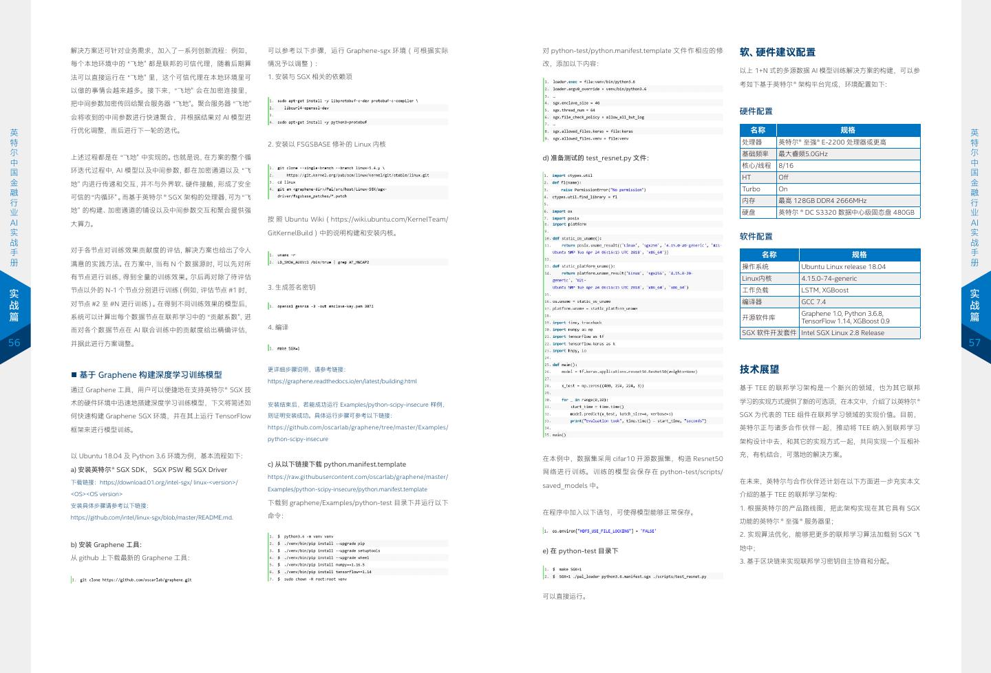 29 . 解决方案还可针对业务需求,加入了一系列创新流程:例如, 可以参考以下步骤,运行 Graphene-sgx 环境(可根据实际 对 python-test/python.manifest.template 文件作相应的修 软、硬件建议配置 每个本地环境中的 “飞地” 都是联邦的可信代理,随着后期算 情况予以调整): 改,添加以下内容: 以上 1+N 式的多源数据 AI 模型训练解决方案的构建,可以参 法可以直接运行在 “飞地” 里,这个可信代理在本地环境里可 1. 安装与 SGX 相关的依赖项 考如下基于英特尔® 架构平台完成,环境配置如下: 以做的事情会越来越多。接下来,“飞地” 会在加密连接里, 把中间参数加密传回给聚合服务器 “飞地”。聚合服务器 “飞地” 硬件配置 会将收到的中间参数进行快速聚合,并根据结果对 AI 模型进 英 行优化调整,而后进行下一轮的迭代。 名称 规格 英 特 2. 安装以 FSGSBASE 修补的 Linux 内核 处理器 英特尔® 至强® E-2200 处理器或更高 特 尔 上述过程都是在 “飞地” 中实现的。也就是说,在方案的整个循 基础频率 最大睿频5.0GHz 尔 d) 准备测试的 test_resnet.py 文件: 中 核心/线程 8/16 中 国 环迭代过程中,AI 模型以及中间参数,都在加密通道以及 “飞 国 HT Off 金 地” 内进行传递和交互,并不与外界软、硬件接触,形成了安全 金 Turbo On 融 可信的 “内循环” 。而基于英特尔 ® SGX 架构的处理器,可为 “飞 融 行 内存 最高 128GB DDR4 2666MHz 行 业 地” 的构建、加密通道的铺设以及中间参数交互和聚合提供强 硬盘 英特尔 ® DC S3320 数据中心级固态盘 480GB 业 按 照 Ubuntu Wiki(https://wiki.ubuntu.com/KernelTeam/ AI 大算力。 AI 实 GitKernelBuild)中的说明构建和安装内核。 软件配置 实 战 战 手 对于各节点对训练效果贡献度的评估,解决方案也给出了令人 手 名称 规格 册 满意的实践方法。在方案中,当有 N 个数据源时,可以先对所 操作系统 Ubuntu Linux release 18.04 册 有节点进行训练,得到全量的训练效果。尔后再对除了待评估 Linux内核 4.15.0-74-generic 节点以外的 N-1 个节点分别进行训练(例如,评估节点 #1 时, 3. 生成签名密钥 工作负载 LSTM, XGBoost 实 实 编译器 GCC 7.4 战 对节点 #2 至 #N 进行训练)。在得到不同训练效果的模型后, 战 Graphene 1.0, Python 3.6.8, 篇 系统可以计算出每个数据节点在联邦学习中的 “贡献系数”,进 开源软件库 TensorFlow 1.14, XGBoost 0.9 篇 而对各个数据节点在 AI 联合训练中的贡献度给出精确评估, 4. 编译 SGX 软件开发套件 Intel SGX Linux 2.8 Release 56 并据此进行方案调整。 57 ■ 基于 Graphene 构建深度学习训练模型 更详细步骤说明,请参考链接: 技术展望 https://graphene.readthedocs.io/en/latest/building.html 通过 Graphene 工具,用户可以便捷地在支持英特尔® SGX 技 基于 TEE 的联邦学习架构是一个新兴的领域,也为其它联邦 术的硬件环境中迅速地搭建深度学习训练模型,下文将简述如 安装结束后,若能成功运行 Examples/python-scipy-insecure 样例, 学习的实现方式提供了新的可选项,在本文中,介绍了以英特尔® 何快速构建 Graphene SGX 环境,并在其上运行 TensorFlow 则证明安装成功。具体运行步骤可参考以下链接: SGX 为代表的 TEE 组件在联邦学习领域的实现价值。目前, 框架来进行模型训练。 https://github.com/oscarlab/graphene/tree/master/Examples/ 英特尔正与诸多合作伙伴一起,推动将 TEE 纳入到联邦学习 python-scipy-insecure 架构设计中去,和其它的实现方式一起,共同实现一个互相补 以 Ubuntu 18.04 及 Python 3.6 环境为例,基本流程如下: 充,有机结合,可落地的解决方案。 在本例中,数据集采用 cifar10 开源数据集,构造 Resnet50 c) 从以下链接下载 python.manifest.template a) 安装英特尔® SGX SDK, SGX PSW 和 SGX Driver 网络进行训练。训练的模型会保存在 python-test/scripts/ https://raw.githubusercontent.com/oscarlab/graphene/master/ 下载链接:https://download.01.org/intel-sgx/ linux-<version>/ 在未来,英特尔与合作伙伴还计划在以下方面进一步充实本文 saved_models 中。 Examples/python-scipy-insecure/python.manifest.template <OS><OS version> 介绍的基于 TEE 的联邦学习架构: 安装具体步骤请参考以下链接: 下载到 graphene/Examples/python-test 目录下并运行以下 1. 根据英特尔的产品路线图,把此架构实现在其它具有 SGX 在程序中加入以下语句,可使得模型能够正常保存。 https://github.com/intel/linux-sgx/blob/master/README.md. 命令: 功能的英特尔 ® 至强 ® 服务器里; 2. 实现算法优化,能够把更多的联邦学习算法加载到 SGX 飞 b) 安装 Graphene 工具: e) 在 python-test 目录下 地中; 从 github 上下载最新的 Graphene 工具: 3. 基于区块链来实现联邦学习密钥自主协商和分配。 可以直接运行。