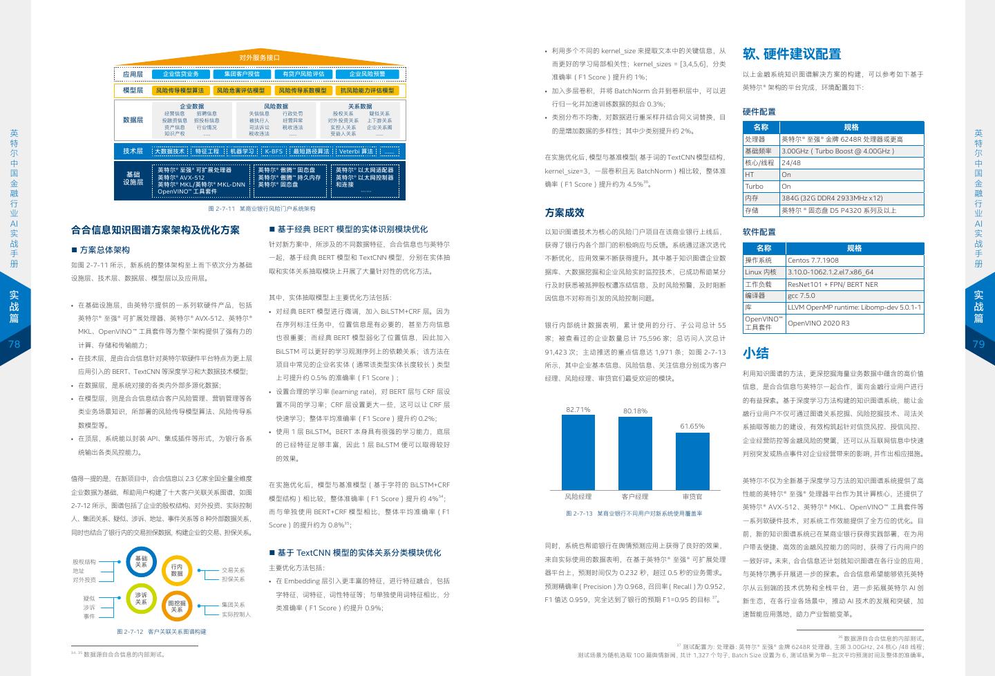 15 . 软硬件配置建议 该商业银行用户基于混合模型构建的训练和推理集群,全部基 于英特尔® 架构平台。英特尔® 架构处理器平台不仅在内核、 以上信贷逾期风险预测模型的构建,可以参考以下基于英特尔® 信贷预期风险预测应用 高速缓存等方面表现优异,还能以大量的硬件增强技术助力提 架构平台的环境进行配置: 升框架性能。例如,英特尔® 至强® 处理器和英特尔® 至强 ® 使用英特尔® MKL-DNN 英特尔® Python 优化的TensorFlow 分发包 存储:HBase、HDFS 硬件配置 可扩展处理器所具备的英特尔® AVX-512,可以为 XGBoost 模型提供出色的并行计算能力。 英特尔® MKL-DNN/MKL 名称 规格 英 处理器 双路英特尔® 至强® 金牌 6230 处理器或更高 英 操作系统:RedHat 特 操作系统:RedHat 基础频率 2.10GHz 特 尔 VMware ESXi 核心/线程 16/32 小结 尔 中 中 HT On 国 人工智能(AI)平台 数据平台 利用多样化的 AI 方法为金融用户提供适合的解决方案,是英 国 金 Turbo On 金 英特尔® 以太网 特尔结合自身技术能力,面向行业推出量身定制解决方案的有 融 英特尔® 至强® 英特尔® 以太网融合网络 英特尔® 至强® 融合网络适配器 内存 192G (16G DDR4 2666MHz x12) 融 金牌 6130 处理器 适配器X710- DA2 金牌 6130 处理器 行 X710- DA2 硬盘 英特尔® DC S3320数据中心级固态盘 480GB 益尝试。基于 LSTM 和传统机器学习的混合预测模型,不仅在 行 业 BIOS SE5C620.86B.00.01.0013.030920180427 预测准确性上获得了令人满意的效果,也充分满足了用户对于 业 AI 图 2-2-4 贷款逾期风险混合预测模型软件栈 AI 预测过程可解释性的要求。 实 软件配置 实 战 战 手 名称 规格 英特尔不仅为这一新型的混合预测提供了高性能处理器产品, 手 册 操作系统 CentOS Linux release 7.4.1708 (Core) 册 ■ 软件栈 其次,在离线系统中,来自外部数据子系统和在线系统的部分 还 提 供 了 面 向 英 特 尔® 架 构 优 化 的 TensorFlow 和 英 特 尔® Linux内核 3.10.0-957.12.1.el7.x86_64 贷款逾期风险混合预测模型软件栈如图 2-2-4 所示,在左 数据将被汇入一个数据集市(Data Mart),而后这些数据在 Python 分发包等多样化的软件优化能力,从而有力地提升了 工作负载 LSTM/XGBoost 实 侧,其底层是由英特尔® 至强 ® 金牌 6130 处理器和英特尔® 得到清洗之后,进入离线的模型训练和算法部署流程,经训练 它的工作效率。目前,该混合预测模型已在某商业银行用户处 实 编译器 GCC 5.4 战 以太网融合网络适配器 X710-DA2 构建的硬件基础设施;其 后的模型算法将被导入在线子系统的预测系统中。 得到了实践部署,为用户带去了高效、准确的信贷逾期风险预 战 库 英特尔® MKL最新版本 篇 上是 AI 能力层,由 VMware ESXi 提供虚拟化环境,安装有 测能力。未来,双方还计划进一步探索利用 NLP 模型面向大 篇 框架 面向英特尔® 架构优化的TensorFlow发布版 RedHat Linux 操作系统(CentOS Linux release 7.4.1708), 而在在线子系统中,其前置系统首先会将部分数据推给数据 其他软件配置待 英特尔® Python分发包 环境数据展开分析和预测,并使预测的效果更为全面和准确。 28 集市用于模型训练,其它数据则通过数据推送系统,进入由 29 并部署了英特尔® MKL-DNN 或英特尔® MKL、面向英特尔 ® 架构优化的 TensorFlow1.10 以及英特尔® Python 分发包。 Storm 集群构建的分布式实时计算系统进行预测调度等步骤。 虽然在已有的案例方案中,采用了基于英特尔® 至强® 处理器 之后,数据就会进入预测系统进行推理预测,得到的结果将被 某大型商业银行应用案例 / 英特尔® 至强® 可扩展处理器的服务器。在未来,用户还可 在右侧,底层是由英特尔® 至强 ® 金牌 6130 处理器和英特尔 ® 以太网融合网络适配器 X710-DA2 构建的硬件基础设施;其 送到测试平台进行验证,最后的结果经由名单管理模块以及风 选择性能更强,且在 AI 领域有着更多优化措施的第二代英特尔® 成效 上是数据层,安装有 RedHat Linux 操作系统(CentOS Linux 险标签生成模块,再返回离线子系统的算法部署和模型训练模 至强® 可扩展处理器,来构建其解决方案。 块,进行算法迭代。 来自该用户的实际部署验证表明,最终的混合方案可以有效地 release 7.4.1708), 并 部 署 有 Apache HBase 分 布 式 数 据 提升预测的准确率,并大幅降低预测时延。数据显示,与人工 库以及 Hadoop 分布式文件系统(Hadoop Distributed File 预测方案相比,LSTM 方法的准确性提升 1 倍,而混合模型方 System,HDFS),提供分布式数据存储读写能力。在 AI 能 案的预测准确率能够提升 2 倍以上,同时预测时延则缩短到了 力层和数据层之上,部署了贷款逾期风险混合预测应用。 风险标签生成 2 天(预测效率提升 10 倍以上)。另外,在在线预测方案(可 名单管理 放贷风险预测)中,每笔预测时间均小于 1 秒,显著提升了客 ■ 系统架构 测试平台 户满意度。 在实际的系统建设中,如图 2-2-5 所示,贷款逾期风险混合 服务接口 预测系统 算法部署 预测方案可由如下方式构建。整个系统从左至右分为外部数据 Storm 集群 模型训练 数据规划 处理子系统、在线系统以及离线系统。首先,对于外部数据, 数据监控 数据推送 数据清洗 系统通过统一的数据接口汇入数据规划与监控平台,而后由一 数据接口 前置系统 数据集市 个服务接口将部分数据送至离线系统。 准确率 召回率 时延 在线 离线 外部数据 基础设施 人工预测 RNN(LSTM) 模型 RNN(LSTM) 与经