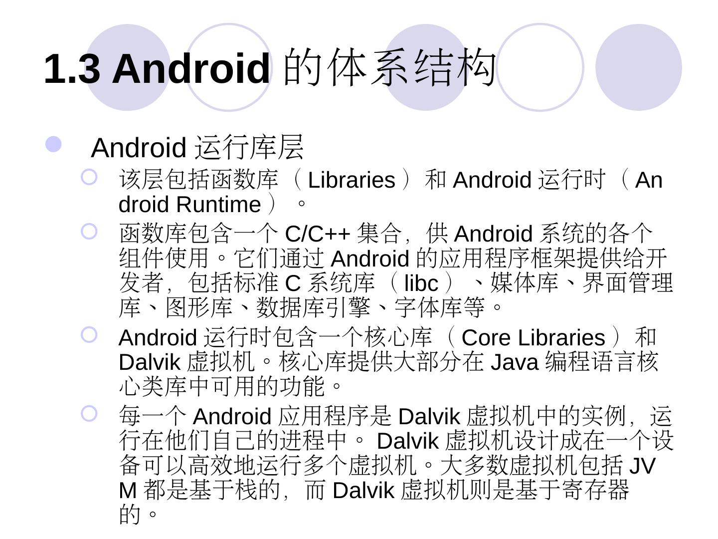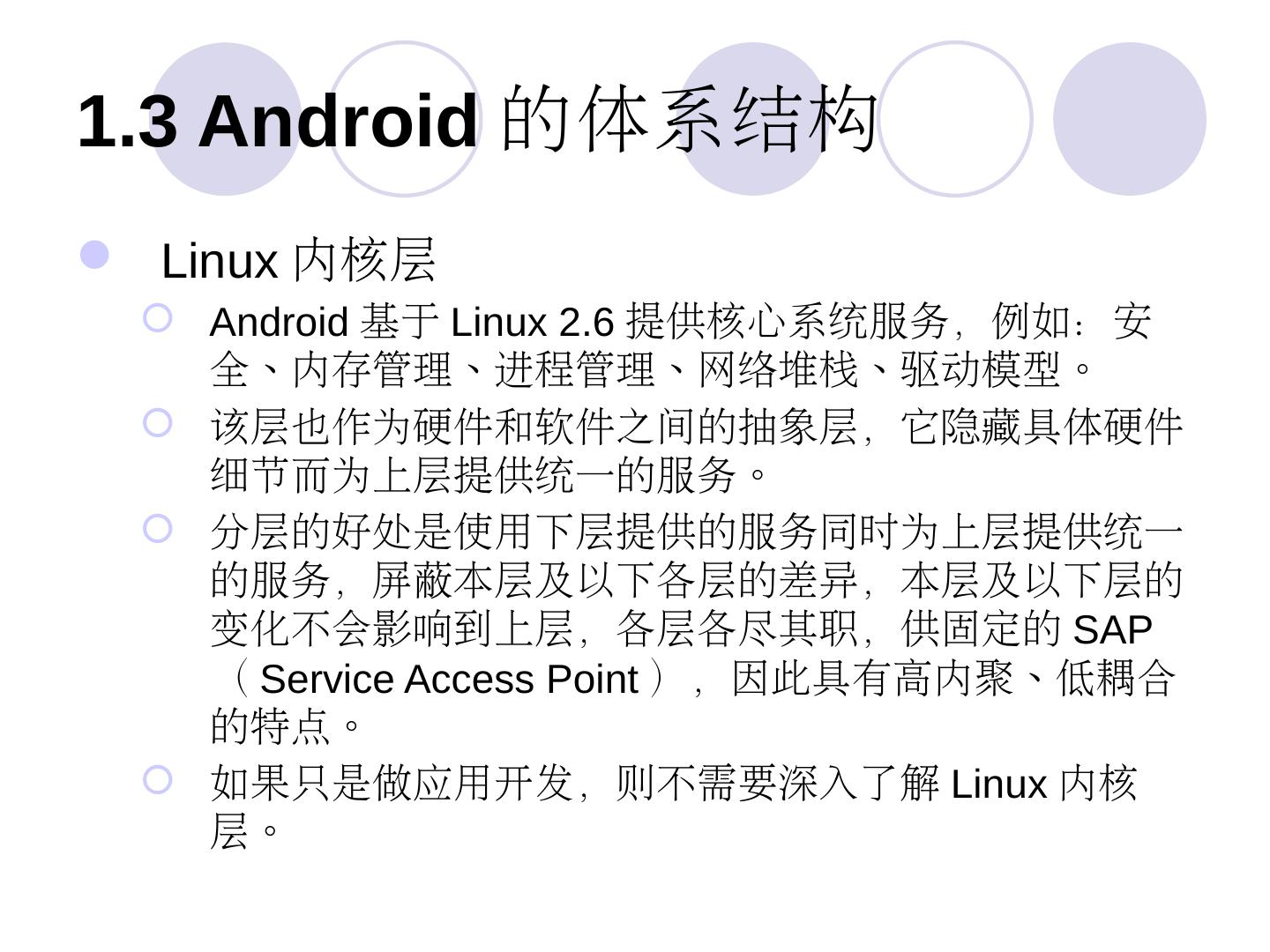 基于Linux内核的软件平台和操作系统,采用HAL架构,共分为4层,从内到外依次为: ... Android基于Linux 2.6提供核心系统服务,例如:安全、内存管理、进程管理、 ...