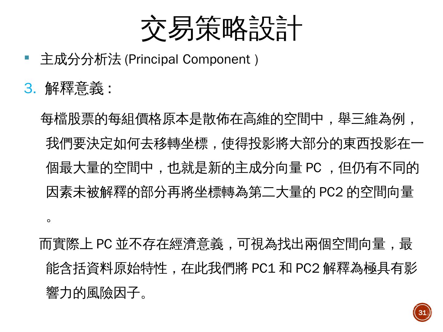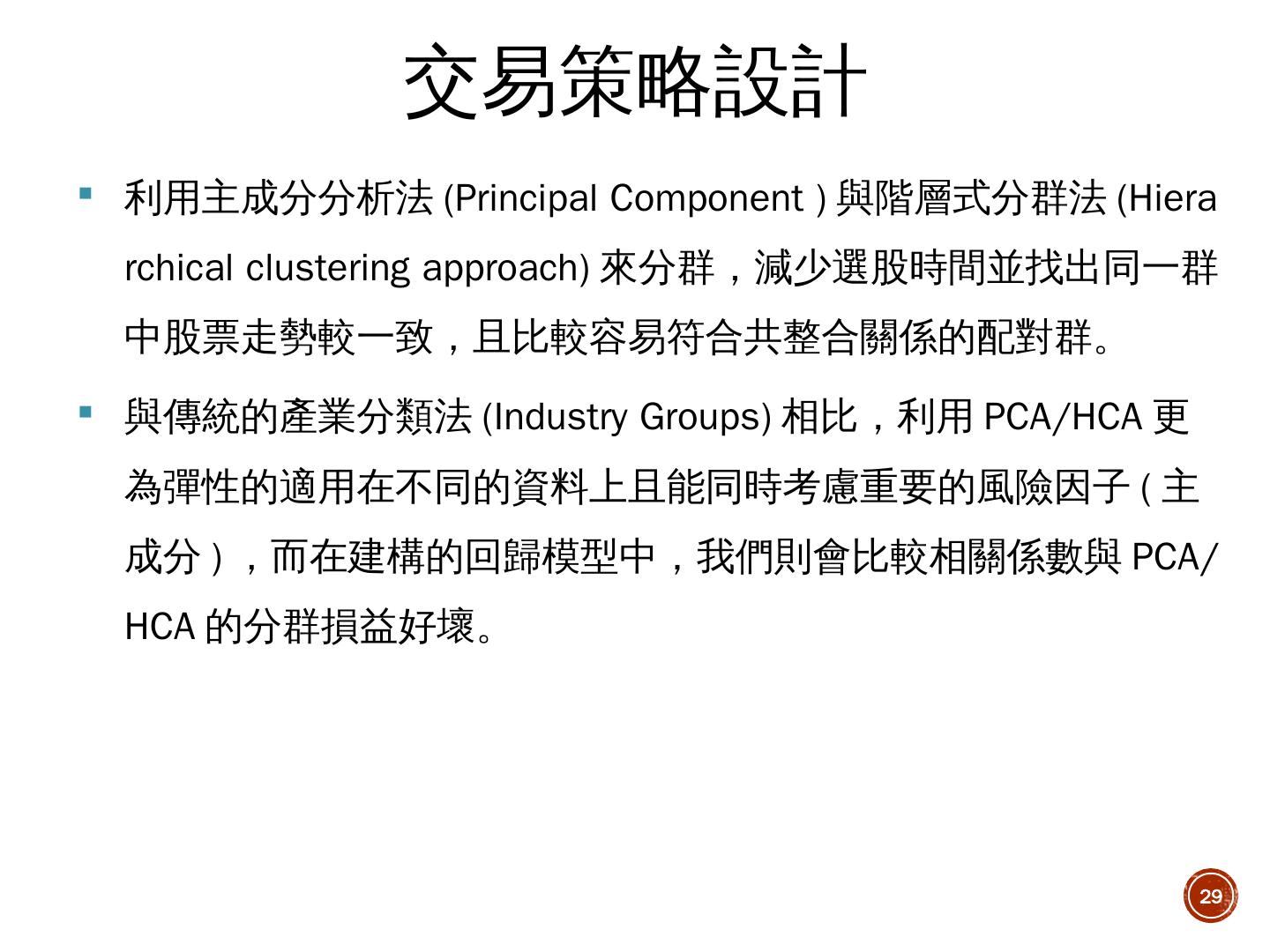再者,配對交易為股票集合中任取兩檔股票做為分析,倘若能有ㄧ個策略能夠從股票集合 .... 利用主成分分析法(Principal Component )與階層式分群 ...
