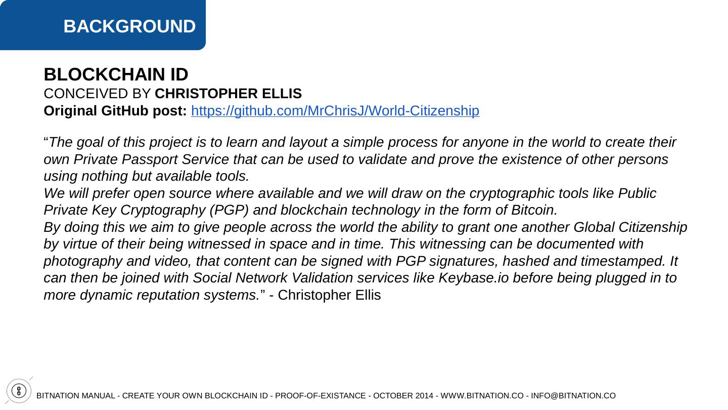 BLOCKCHAIN ID ... their own Private Passport Service that can be used to validate and prove the existence of other persons using nothing but available tools.