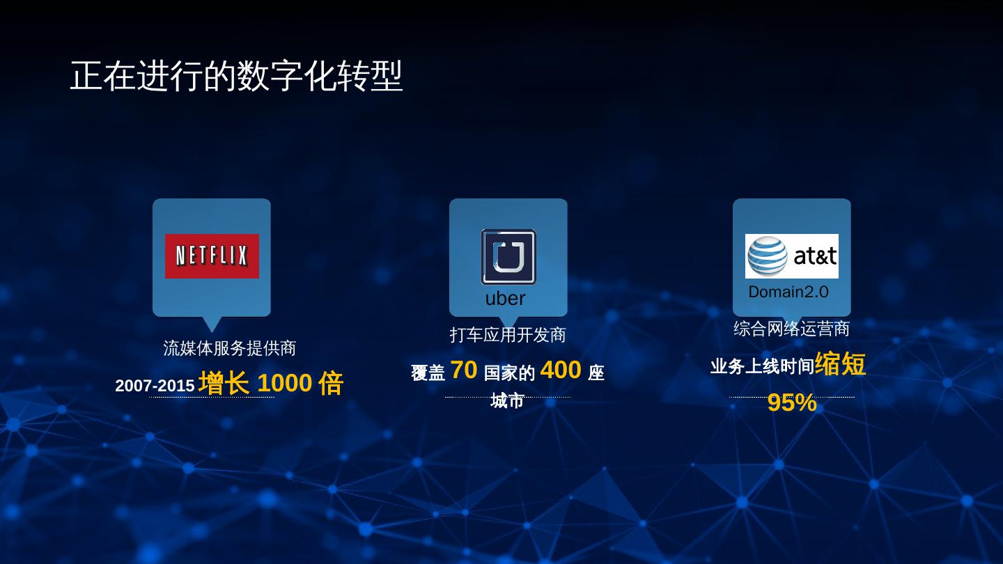 3 .正在进行的数字化转型 uber Domain2.0 打车应用开发商 综合网络运营商 流媒体服务提供商 覆盖 70 国家的 400 座 业务上线时间 缩短 2007-2015 增长 1000 倍 城市 95% 3