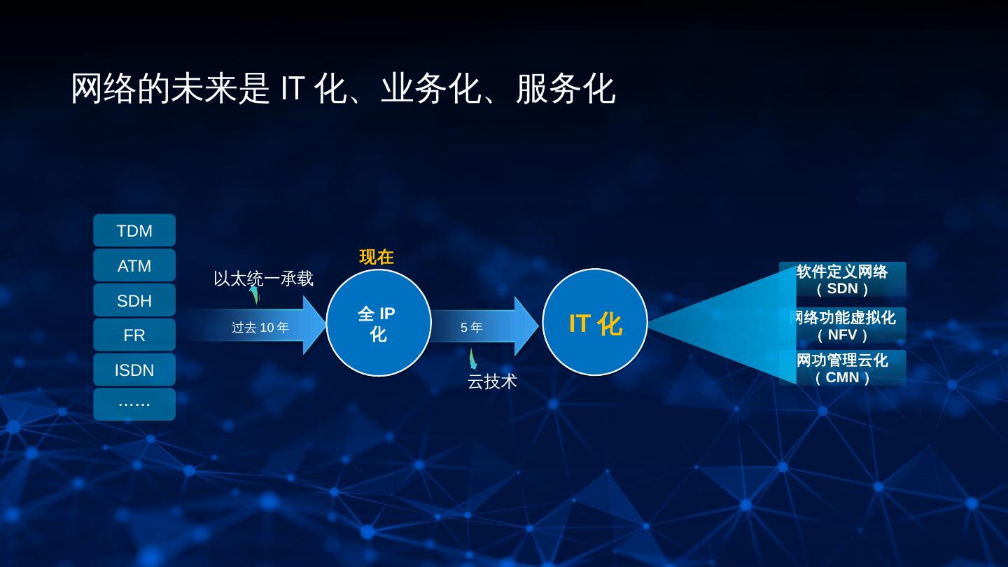 4 .网络的未来是 IT 化、业务化、服务化 TDM 现在 ATM 软件定义网络 以太统一承载 ( SDN ) SDH 全 IP FR 过去 10 年 化 5年 IT 化 网络功能虚拟化 ( NFV ) 网功管理云化 ISDN ( CMN ) 云技术 …… 4