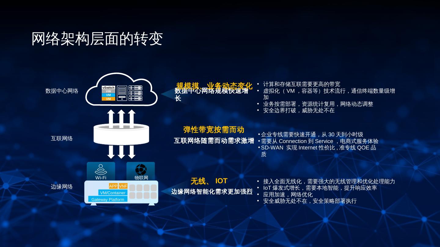 5 .网络架构层面的转变 规模摸、业务动态变化 • 计算和存储互联需要更高的带宽 vSwitch 数据中心网络 VW 数据中心网络规模快速增 • 虚拟化( VM ,容器等)技术流行,通信终端数量级增 VM VM 长 加 • 业务按需部署,资源统计复用,网络动态调整 • 安全边界打破,威胁无处不在 弹性带宽按需而动 • 企业专线需要快速开通,从 30 天到小时级 互联网络 互联网络随需而动需求激增 • 需要从 Connection 到 Service ,电商式服务体验 • SD-WAN 实现 Internet 性价比 , 准专线 QOE 品 质 Wi-Fi 物联网 无线、 IOT • 接入全面无线化,需要强大的无线管理和优化处理能力 边缘网络 APP VNF • IoT 爆发式增长,需要本地智能,提升响应效率 VM/Container 边缘网络智能化需求更加强烈 • 应用加速,网络优化 Gateway Platform • 安全威胁无处不在,安全策略部署执行 5
