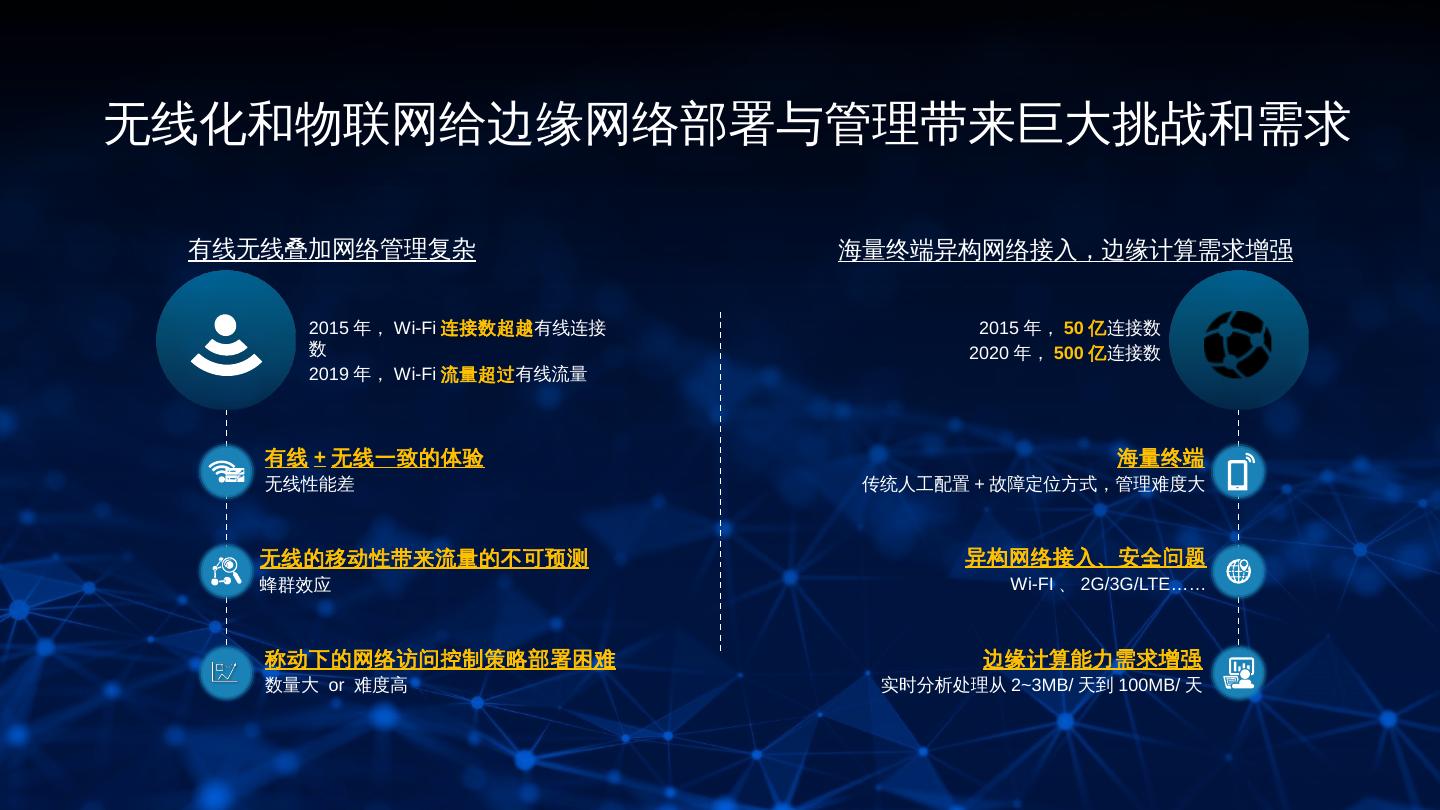 8 .无线化和物联网给边缘网络部署与管理带来巨大挑战和需求 有线无线叠加网络管理复杂 海量终端异构网络接入,边缘计算需求增强 2015 年, Wi-Fi 连接数超越有线连接 2015 年, 50 亿连接数 数 2020 年, 500 亿连接数 2019 年, Wi-Fi 流量超过有线流量 有线 + 无线一致的体验 海量终端 无线性能差 传统人工配置 + 故障定位方式,管理难度大 无线的移动性带来流量的不可预测 异构网络接入、安全问题 蜂群效应 Wi-FI 、 2G/3G/LTE…… 称动下的网络访问控制策略部署困难 边缘计算能力需求增强 数量大 or 难度高 实时分析处理从 2~3MB/ 天到 100MB/ 天 8