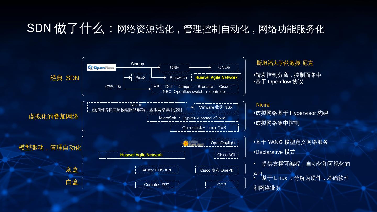 10 . SDN 做了什么:网络资源池化,管理控制自动化,网络功能服务化 Startup 斯坦福大学的教授 尼克 ONF ONOS •转发控制分离,控制面集中 经典 SDN Pica8 Bigswitch Huawei Agile Network •基于 Openflow 协议 传统厂商 HP 、 Dell 、 Juniper 、 Brocade 、 Cisco 、 NEC: Openflow switch + controller Nicira: Vmware 收购 NSX Nicira 虚拟网络和底层物理网络解耦,虚拟网络集中控制 •虚拟网络基于 Hypervisor 构建 虚拟化的叠加网络 MicroSoft : Hypver-V based vCloud •虚拟网络集中控制 Openstack + Linux OVS OpenDaylight •基于 YANG 模型定义网络服务 模型驱动,管理自动化 Huawei Agile Network Cisco ACI •Declarative 模式 • 提供支撑可编程,自动化和可视化的 灰盒 Arista: EOS API Cisco 发布 OnePk API • 基于 Linux ,分解为硬件,基础软件 白盒 Cumulus 成立 OCP 和网络业务 10