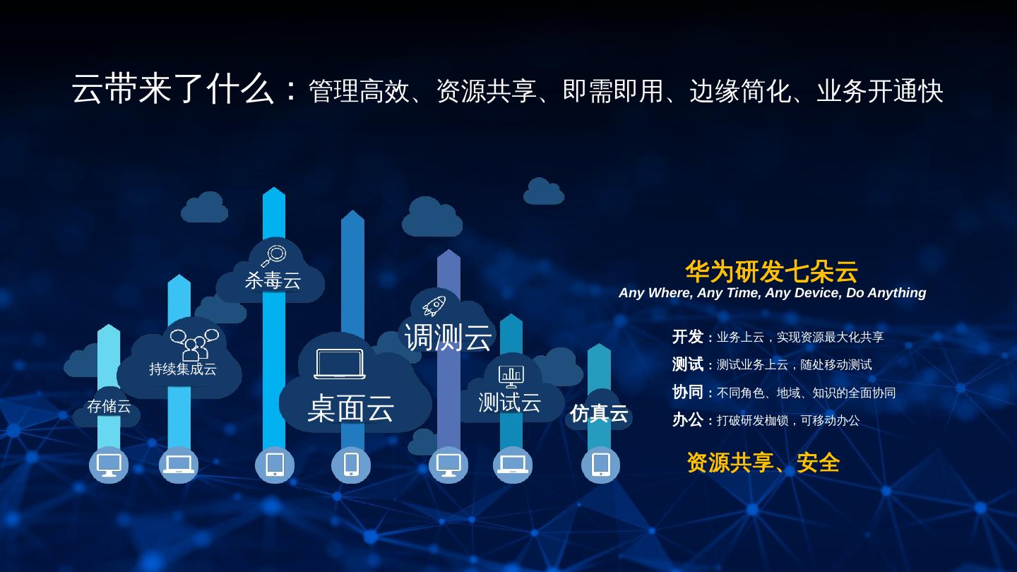 12 .云带来了什么:管理高效、资源共享、即需即用、边缘简化、业务开通快 杀毒云 华为研发七朵云 Any Where, Any Time, Any Device, Do Anything 调测云 开发 :业务上云,实现资源最大化共享 持续集成云 测试 :测试业务上云,随处移动测试 协同 :不同角色、地域、知识的全面协同 存储云 桌面云 测试云 仿真云 办公 :打破研发枷锁,可移动办公 资源共享、安全 12