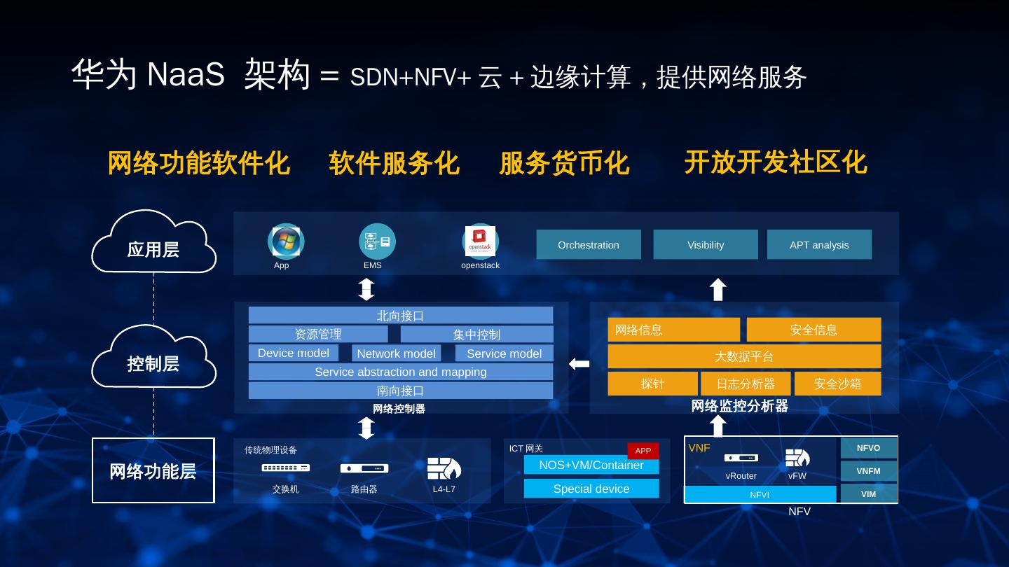 14 .华为 NaaS 架构 = SDN+NFV+ 云 + 边缘计算,提供网络服务 网络功能软件化 软件服务化 服务货币化 开放开发社区化 应用层 Orchestration Visibility APT analysis App EMS openstack 北向接口 资源管理 集中控制 网络信息 安全信息 Device model Network model Service model 大数据平台 控制层 Service abstraction and mapping 探针 日志分析器 安全沙箱 南向接口 网络控制器 网络监控分析器 传统物理设备 ICT 网关 APP VNF NFVO NOS+VM/Container 网络功能层 vRouter vFW VNFM 交换机 路由器 L4-L7 Special device NFVI VIM NFV 14