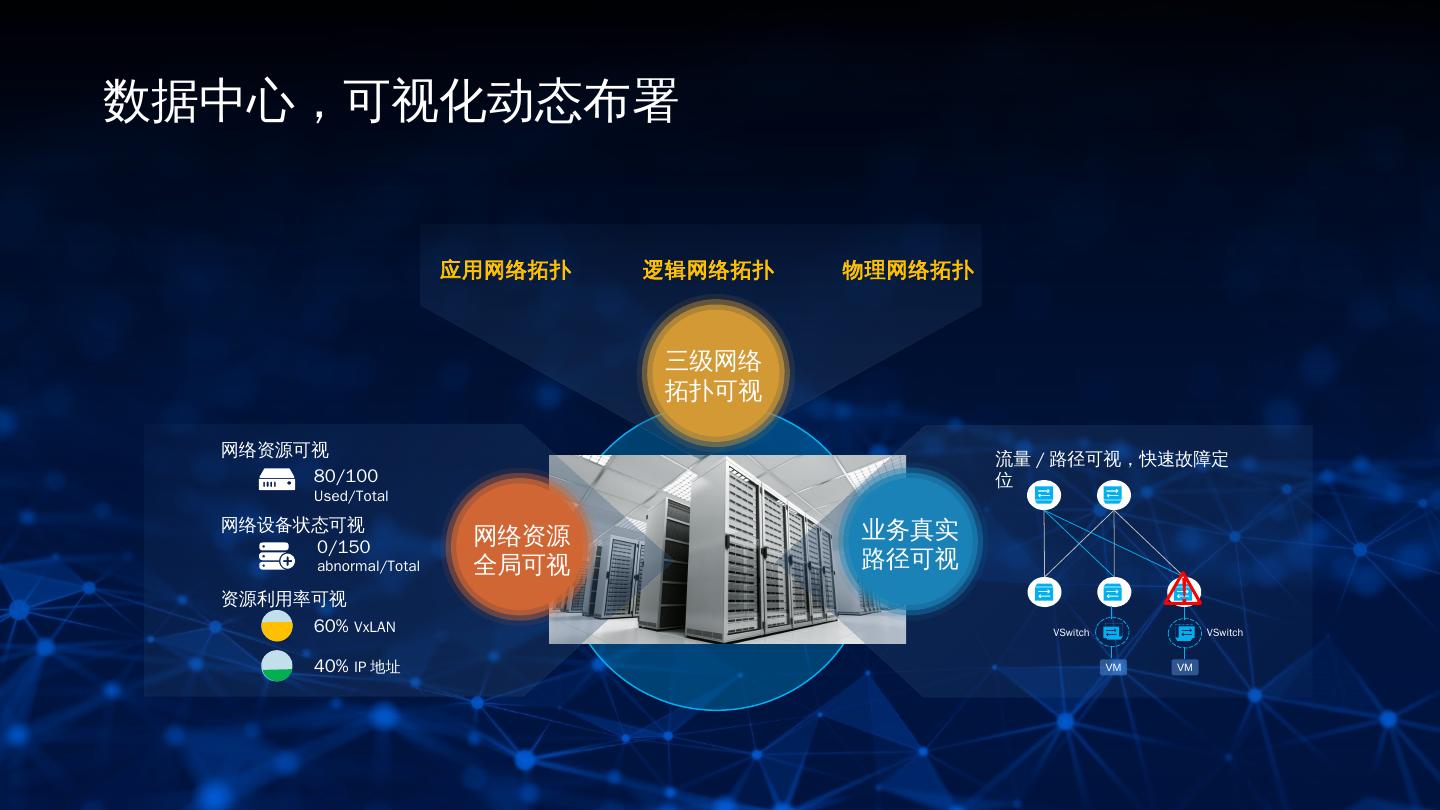 16 .数据中心,可视化动态布署 应用网络拓扑 逻辑网络拓扑 物理网络拓扑 三级网络 拓扑可视 网络资源可视 流量 / 路径可视,快速故障定 80/100 位 Used/Total 网络设备状态可视 业务真实 0/150 网络资源 abnormal/Total 全局可视 路径可视 资源利用率可视 ! 60% VxLAN VSwitch VSwitch 40% IP 地址 VM VM 16