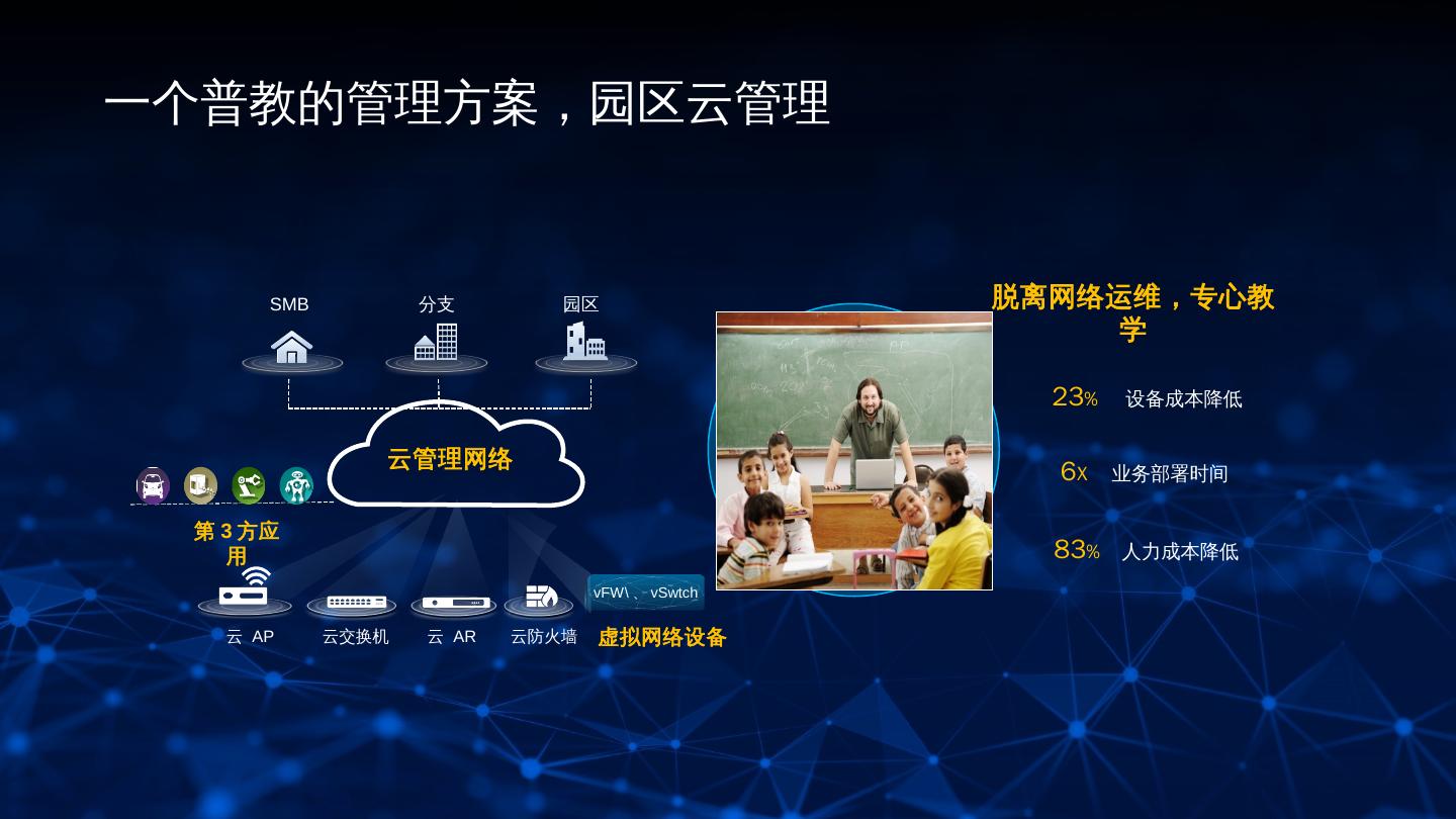 17 .一个普教的管理方案,园区云管理 SMB 分支 园区 脱离网络运维,专心教 学 23% 设备成本降低 云管理网络 6X 业务部署时间 第 3 方应 用 83% 人力成本降低 vFW\ 、 vSwtch 云 AP 云交换机 云 AR 云防火墙 虚拟网络设备 17