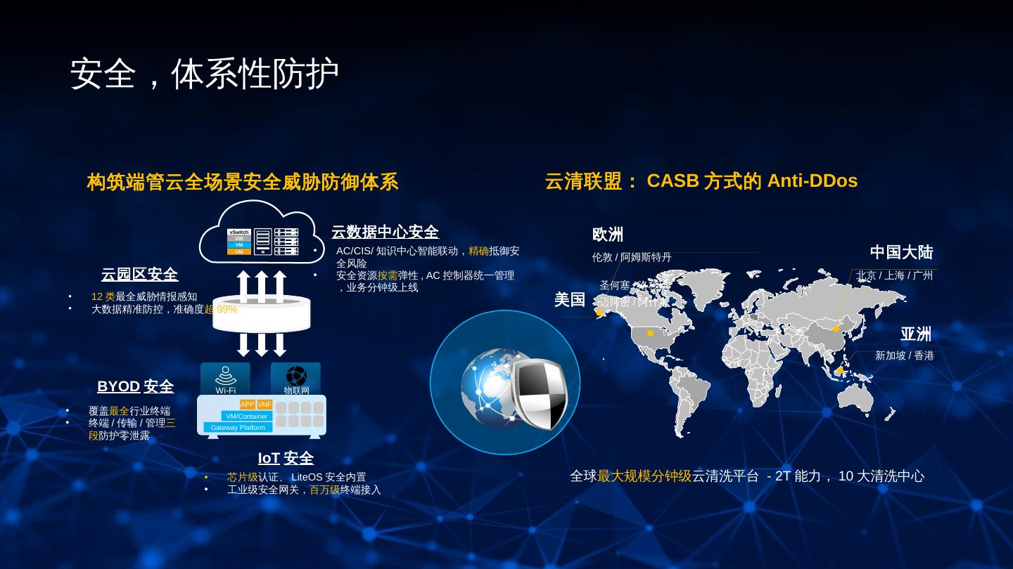 19 . 安全,体系性防护 构筑端管云全场景安全威胁防御体系 云清联盟: CASB 方式的 Anti-DDos vSwitch VW 云数据中心安全 欧洲 VM VM • AC/CIS/ 知识中心智能联动,精确抵御安 伦敦 / 阿姆斯特丹 中国大陆 全风险 云园区安全 • 安全资源按需弹性 , AC 控制器统一管理 北京 / 上海 / 广州 ,业务分钟级上线 圣何塞 / 洛杉矶 • 12 类最全威胁情报感知 美国 迈阿密 / 阿什本 • 大数据精准防控,准确度超 99% 亚洲 新加坡 / 香港 BYOD 安全 Wi-Fi 物联网 APP VNF • 覆盖最全行业终端 VM/Container • 终端 / 传输 / 管理三 Gateway Platform 段防护零泄露 IoT 安全 • 芯片级认证、 LiteOS 安全内置 全球最大规模分钟级云清洗平台 - 2T 能力, 10 大清洗中心 • 工业级安全网关,百万级终端接入 19