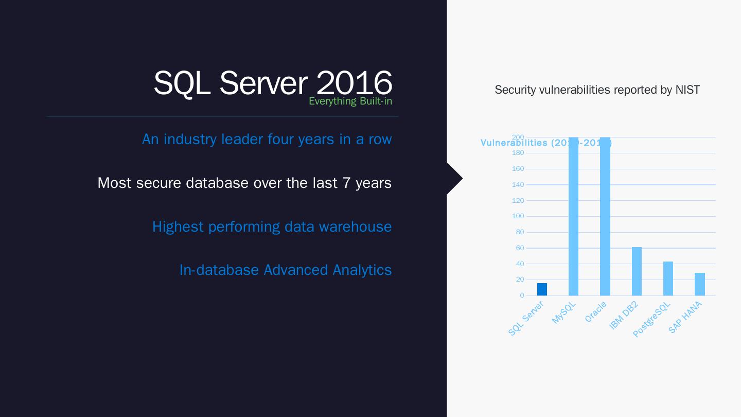 4 .Most secure database over the last 7 years Highest performing data warehouse In-database Advanced Analytics Security vulnerabilities reported by NIST An industry leader four years in a row SQL Server 2016 Everything Built-in