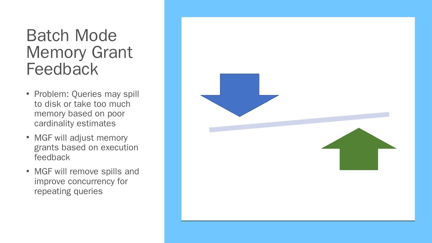 17 .Batch Mode Memory Grant Feedback Problem: Queries may spill to disk or take too much memory based on poor cardinality estimates MGF will adjust memory grants based on execution feedback MGF will remove spills and improve concurrency for repeating queries