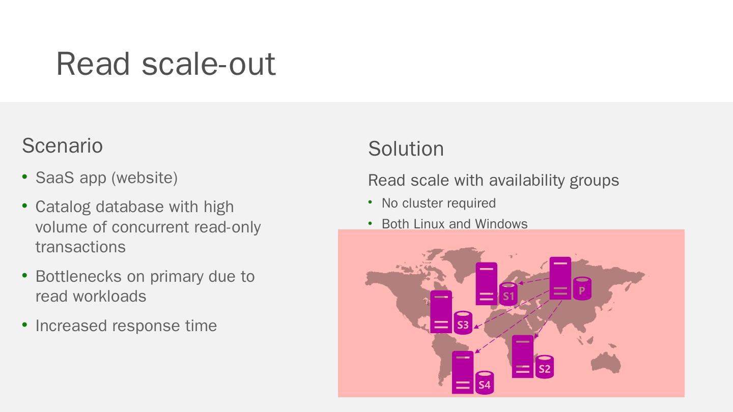 28 .Read scale-out Scenario SaaS app (website) Catalog database with high volume of concurrent read-only transactions Bottlenecks on primary due to read workloads Increased response time Solution Read scale with availability groups No cluster required Both Linux and Windows
