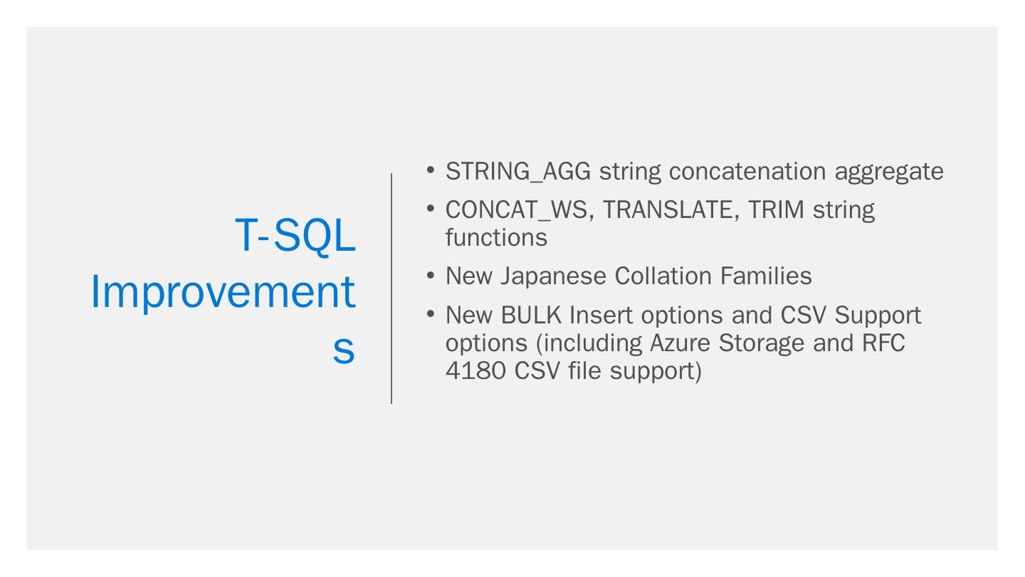 26 .What programmability features are available on Linux? All major language driver compatibility In memory OLTP and Columnstore Compression Always Encrypted, Row Level Security, and data masking AD user authentication (planned) Service Broker Change data capture Partitioning Auditing CLR JSON, XML Third party tools …and more