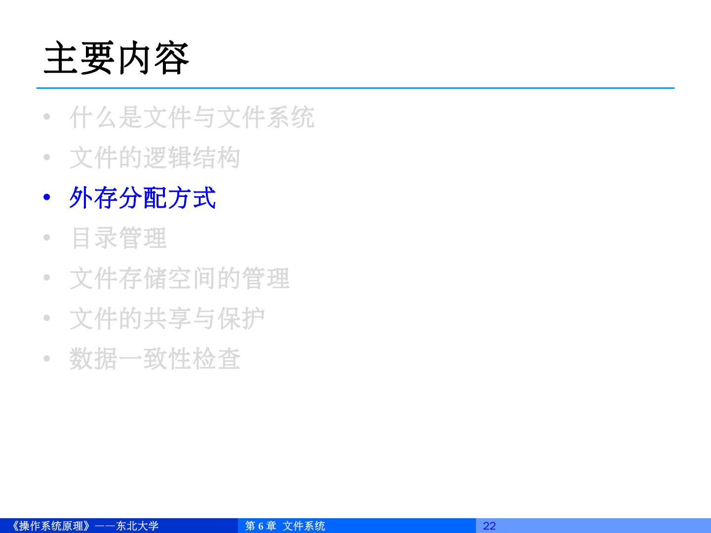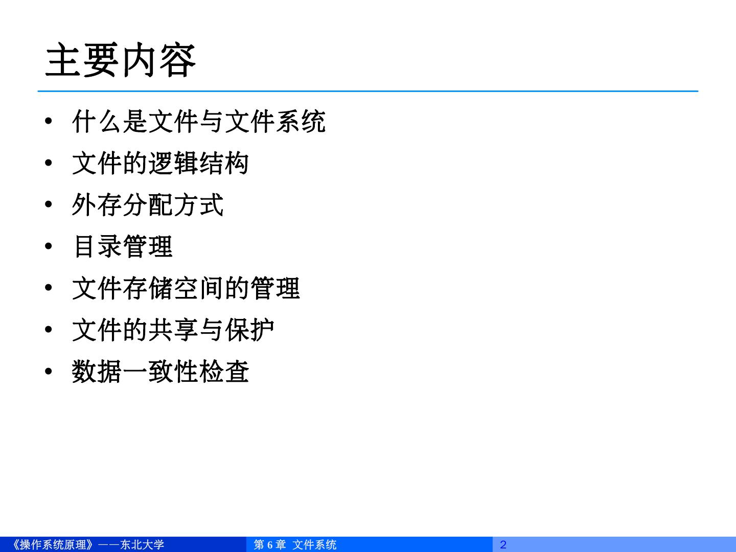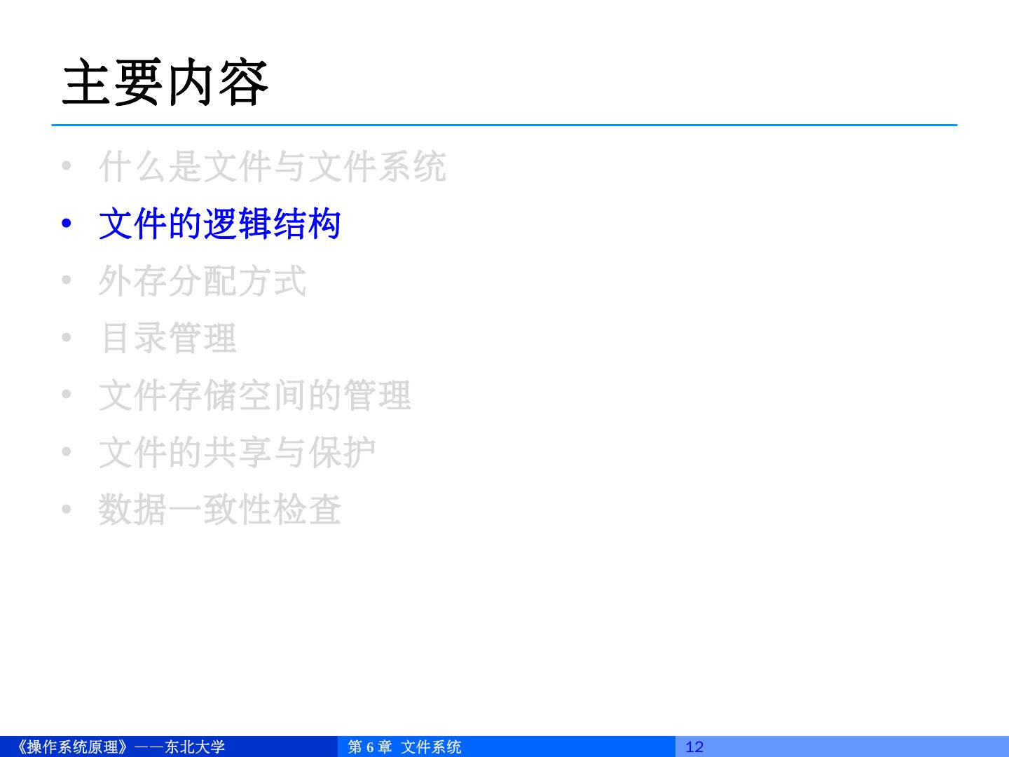主要内容. 什么是文件与文件系统; 文件的逻辑结构; 外存分配方式; 目录管理; 文件存储空间的管理; 文件的共享与保护; 数据一致性检查. 《操作系统原理》——东北大学.