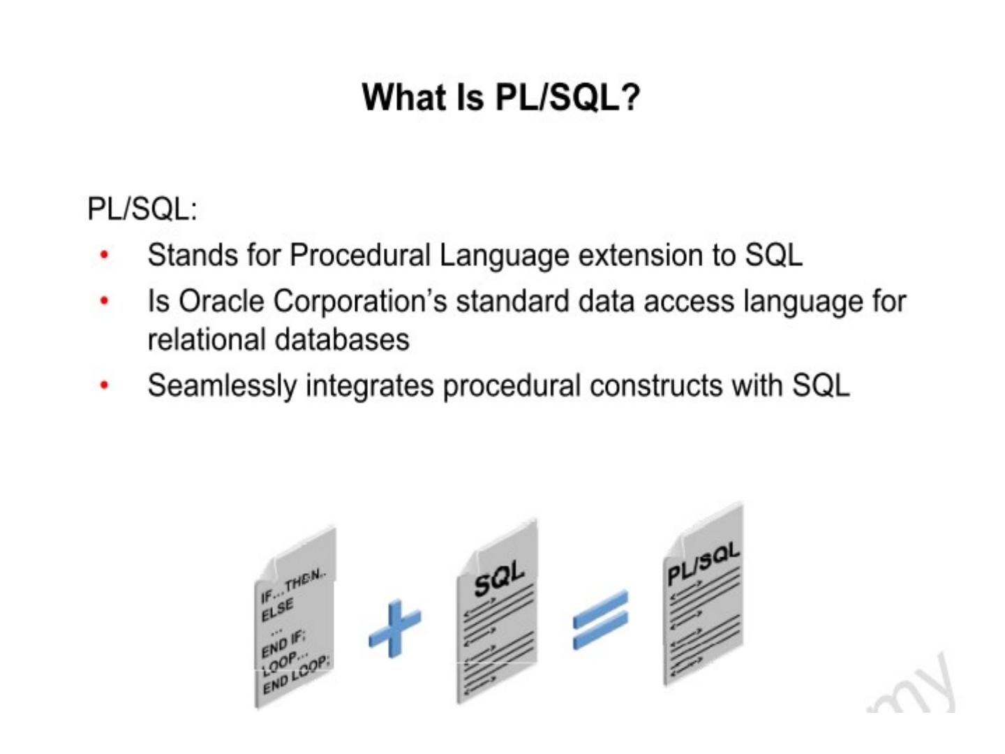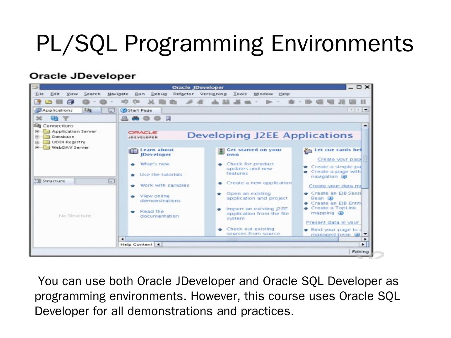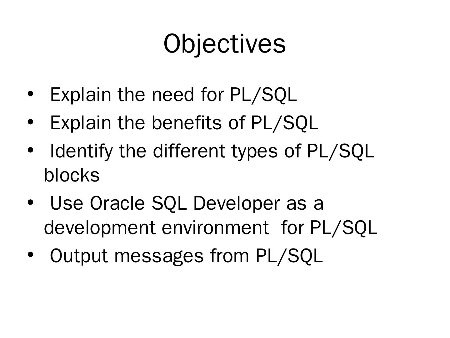 Explain the need for PL/SQL; Explain the benefits of PL/SQL; Identify the different types of PL/SQL blocks; Use Oracle SQL Developer as a development ...