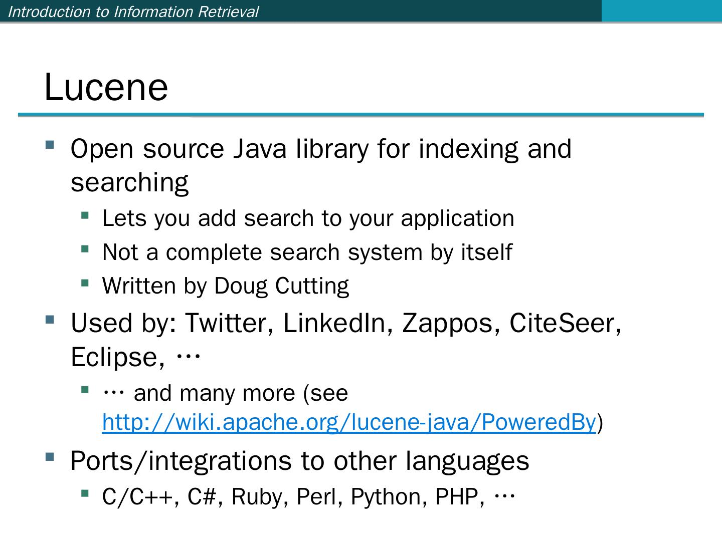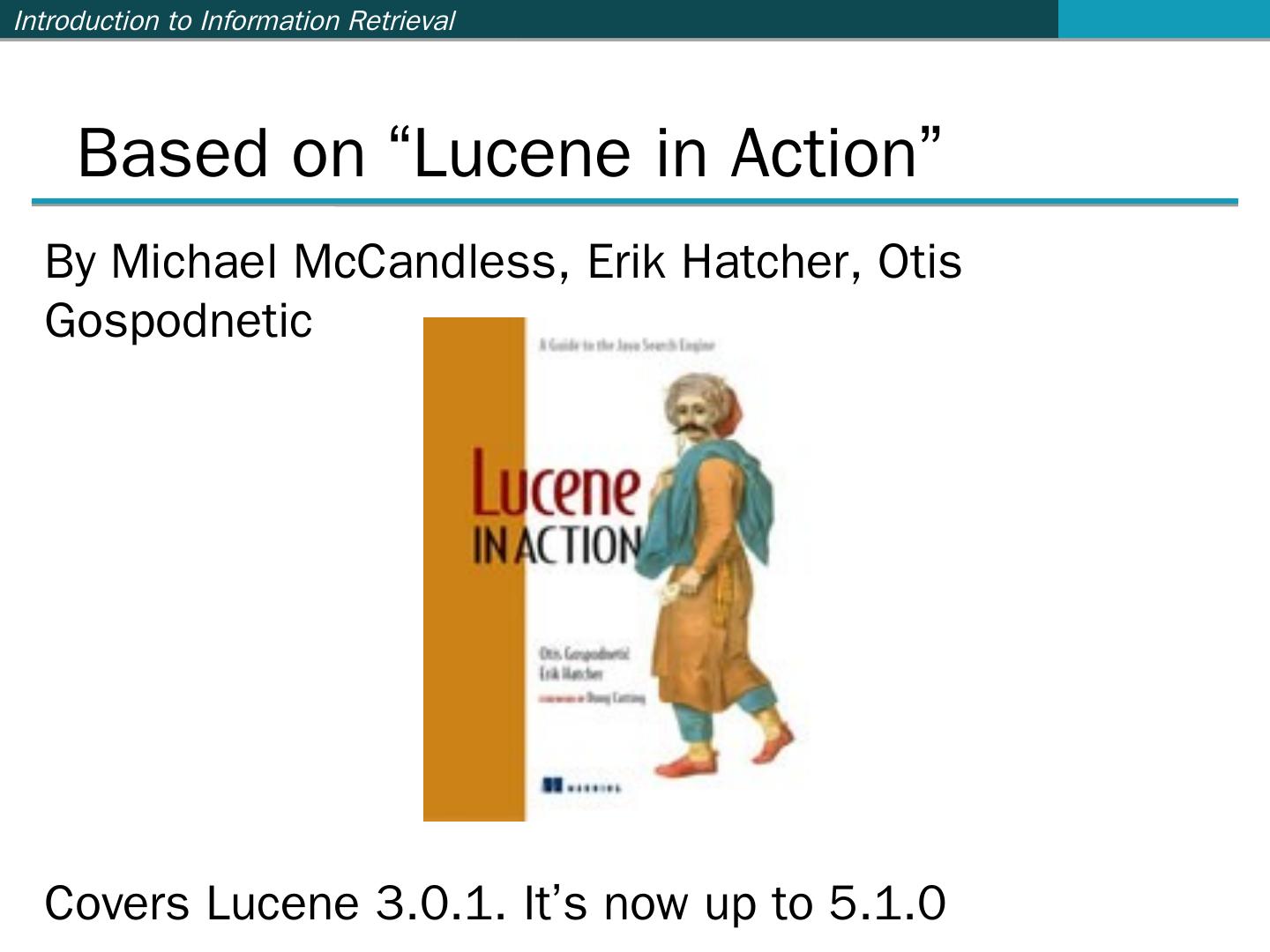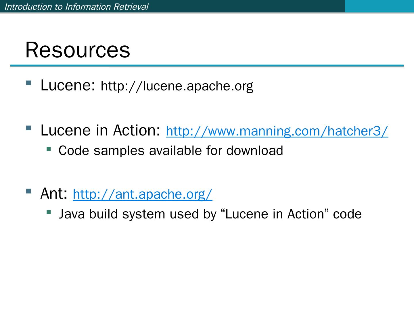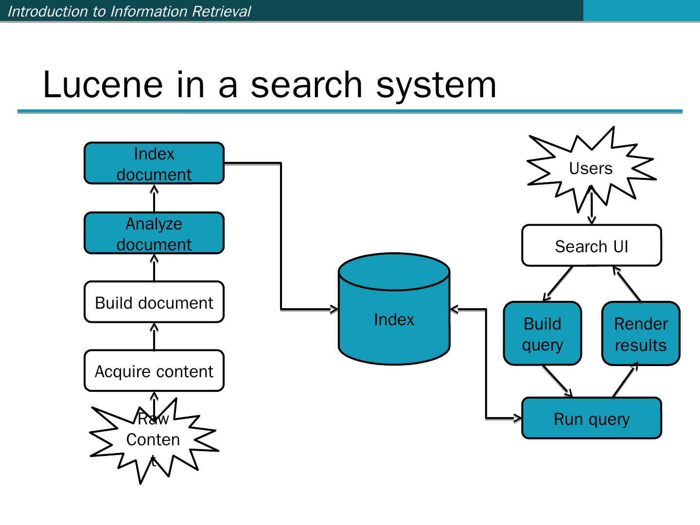 Ant: http://ant.apache.org/. Java build system used by “Lucene in Action” code. Introduction to Information Retrieval. Lucene in a search system. Raw Content.