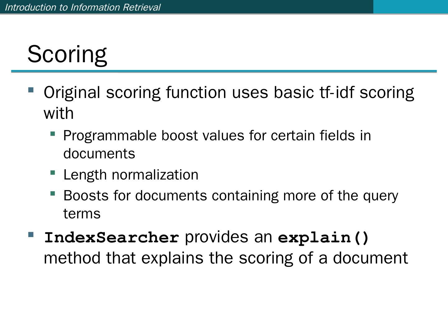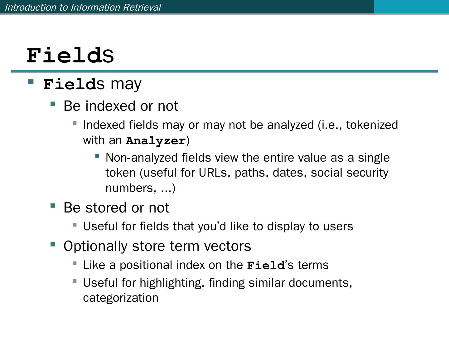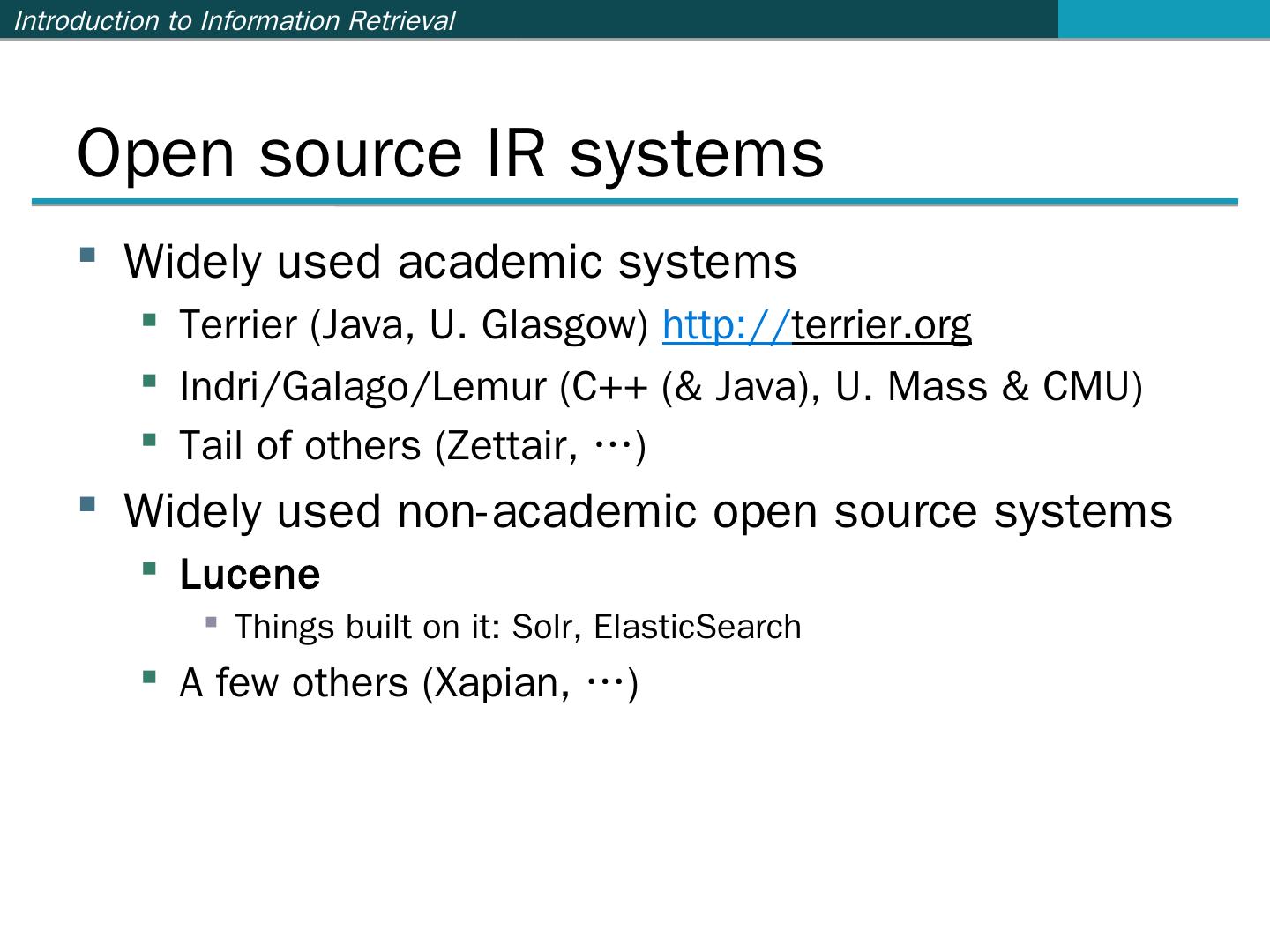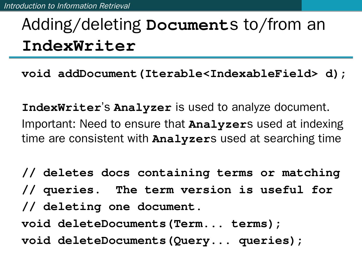 Ant: http://ant.apache.org/. Java build system used by “Lucene in Action” code. Introduction to Information Retrieval. Lucene in a search system. Raw Content.