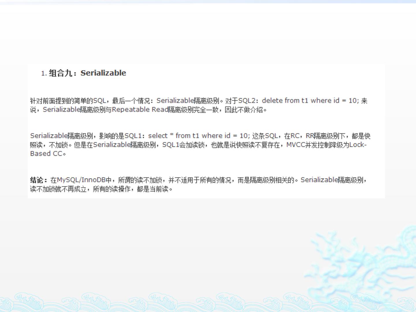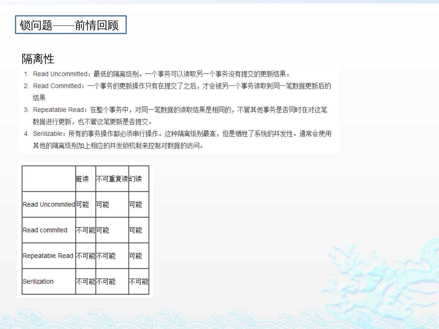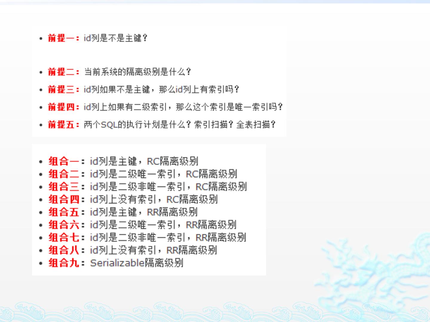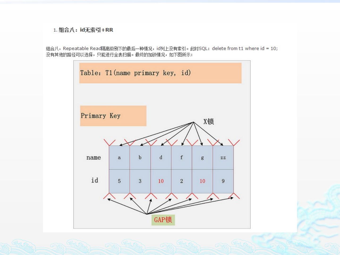 MyIsam和Innodb索引的不同. 锁问题——前情回顾. 隔离性. MyIsam. 永远不会发生死锁. Innodb的MVCC. Innodb加锁浅谈. update t1 set id = 100 where name = 'd';.