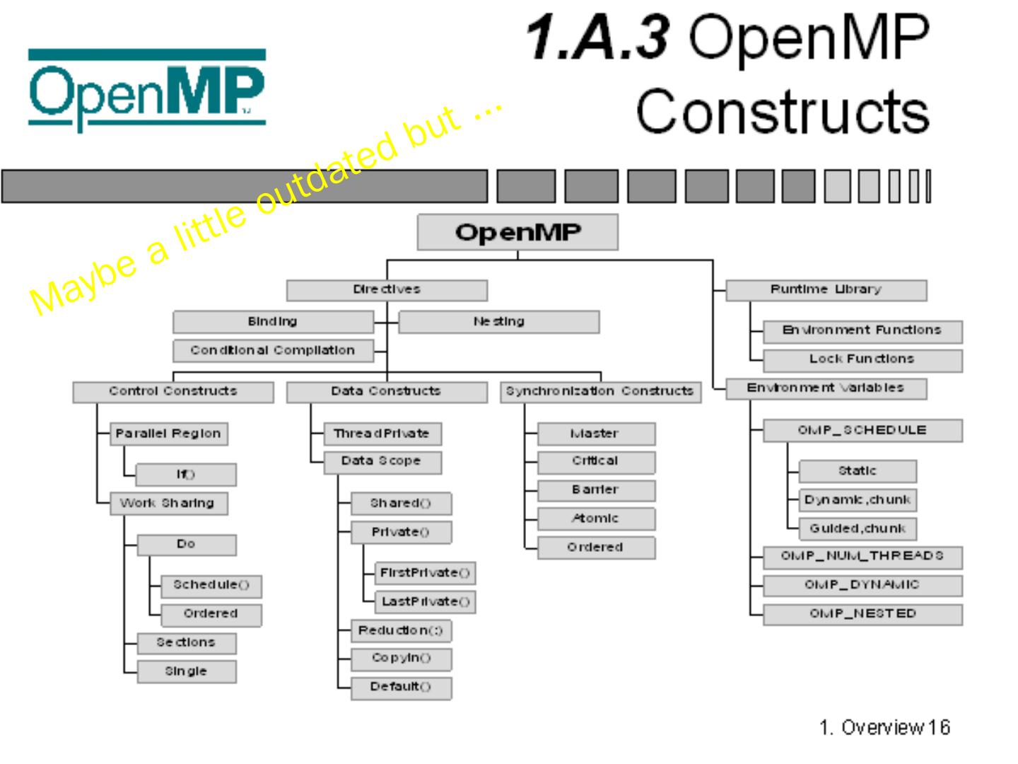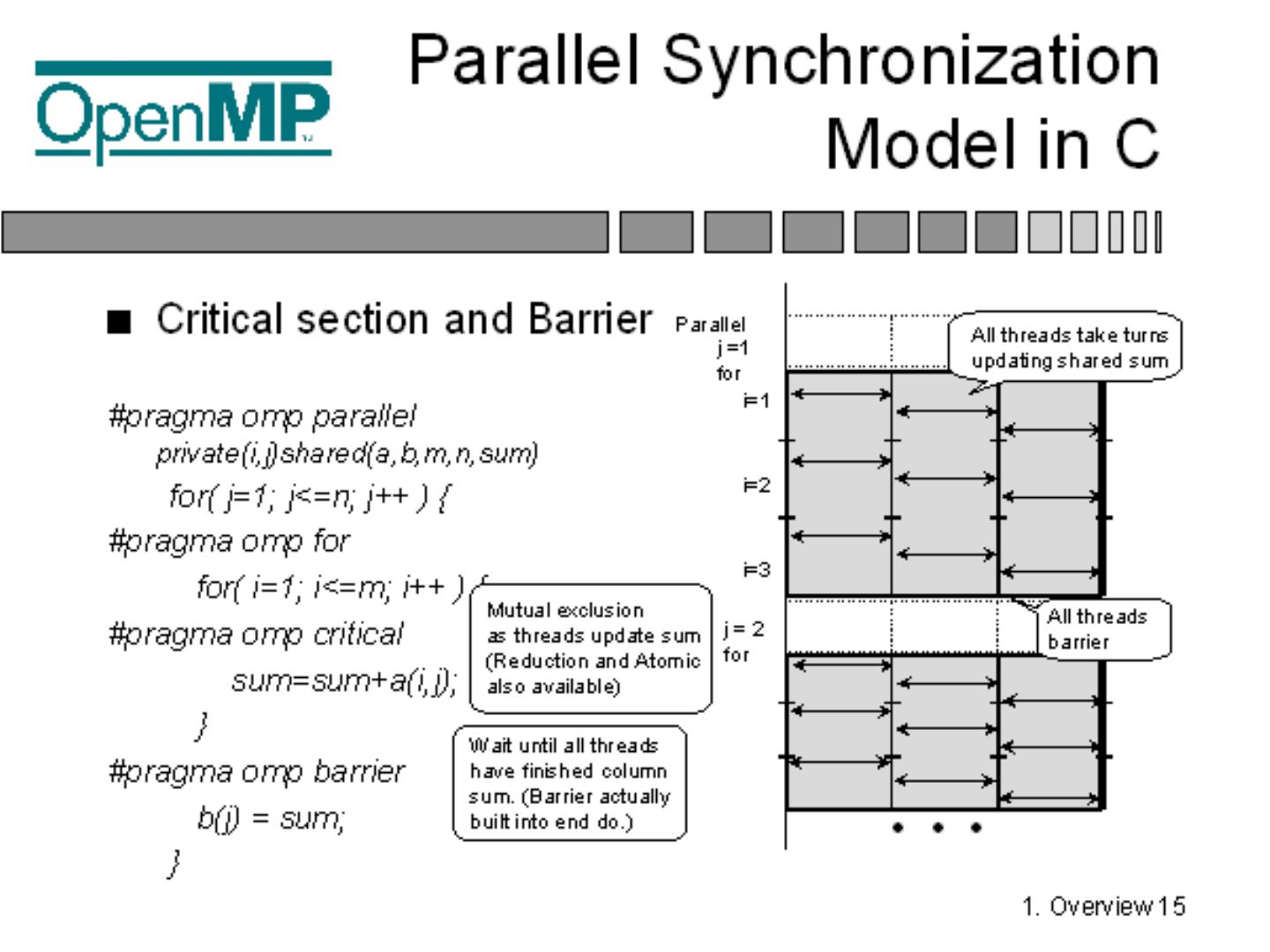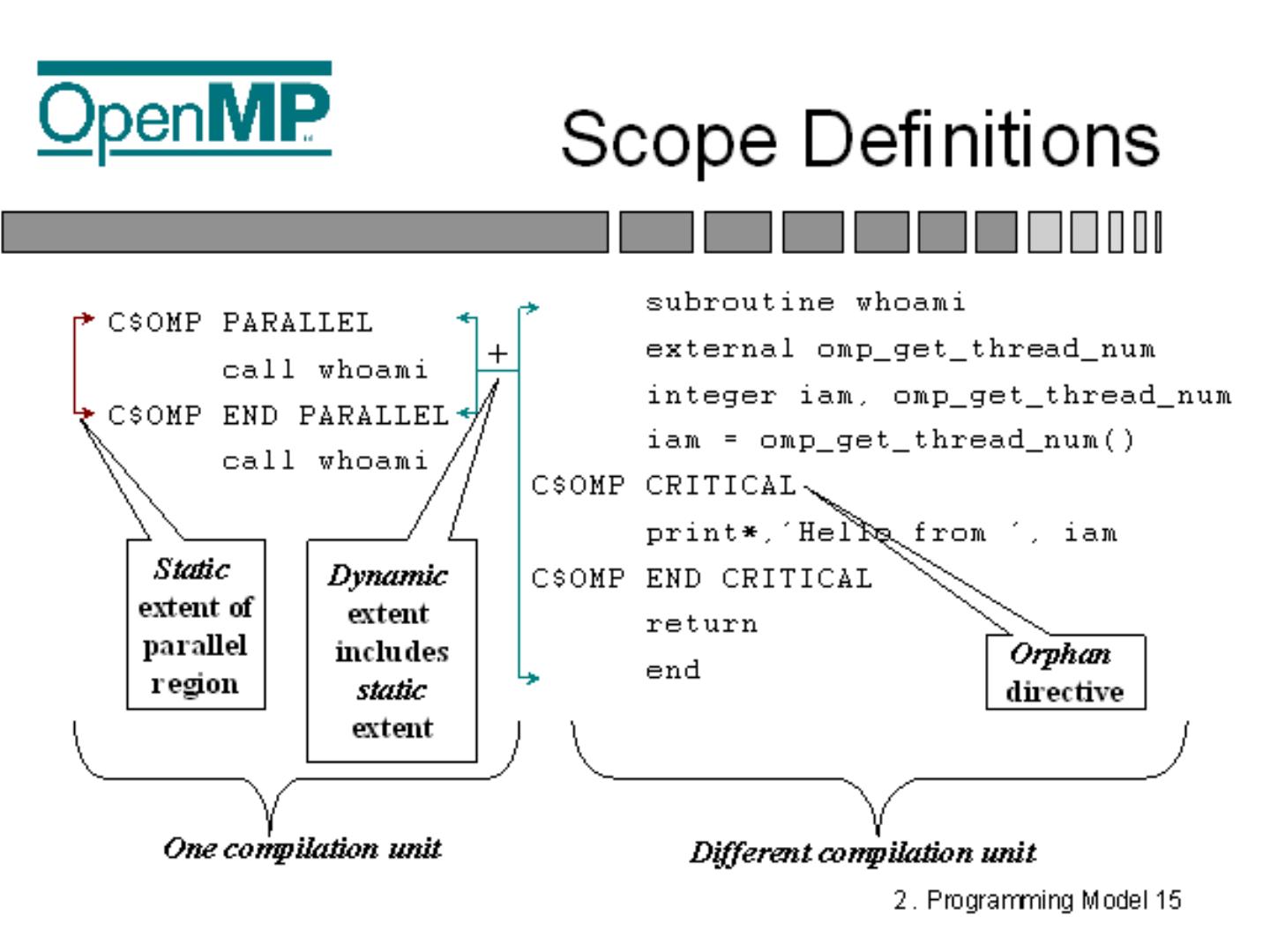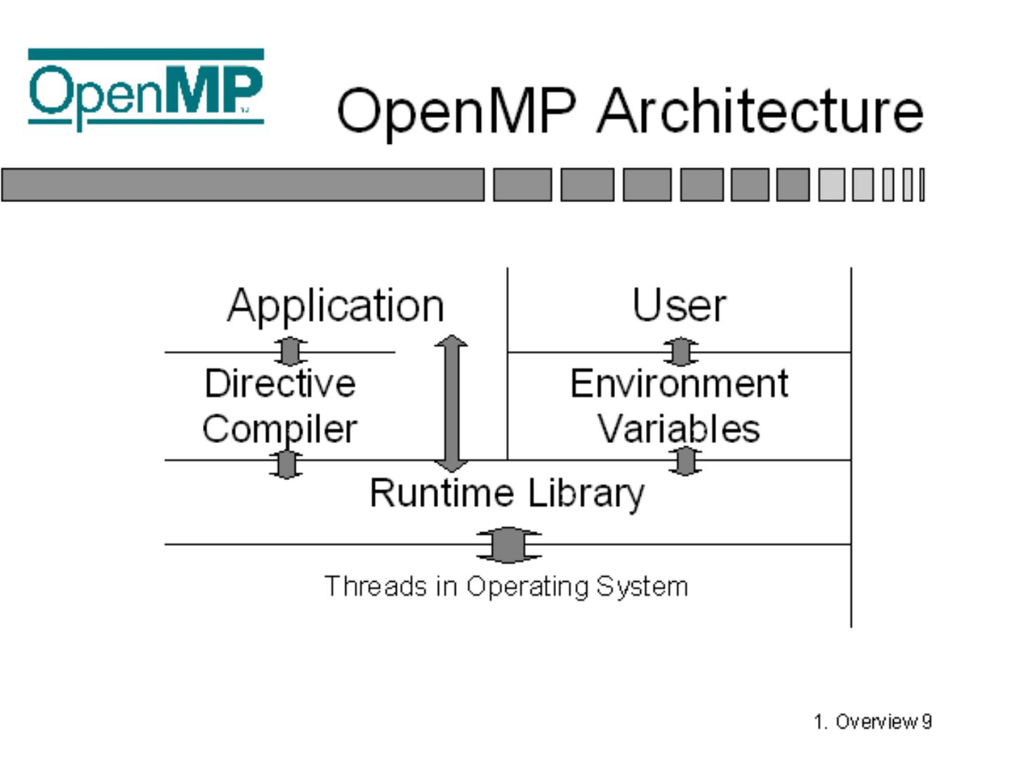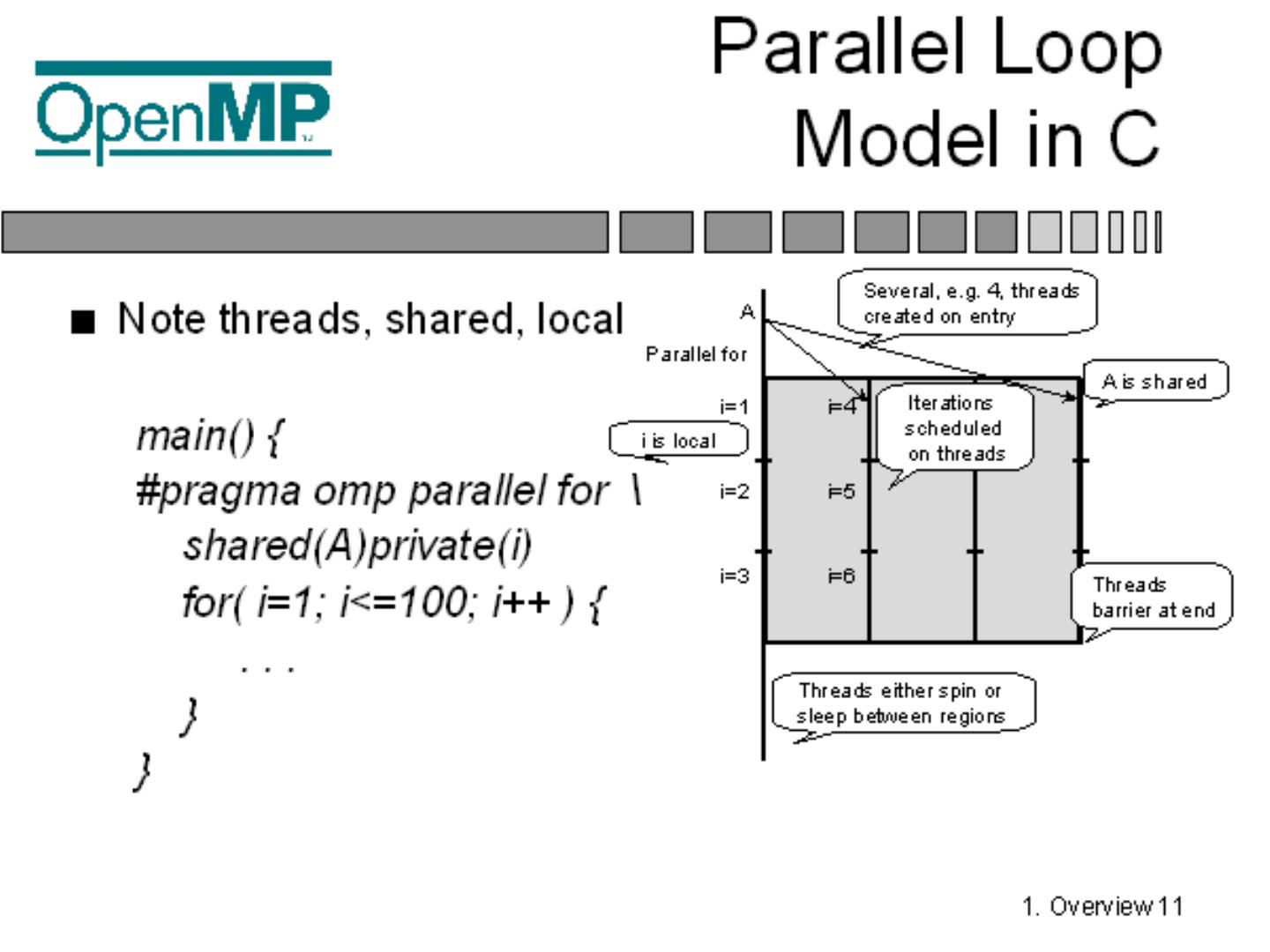 Standardizes fine grained (loop) parallelism; Also supports coarse grained algorithms; The MP in OpenMP is for multi-processing; Don't confuse OpenMP with ...